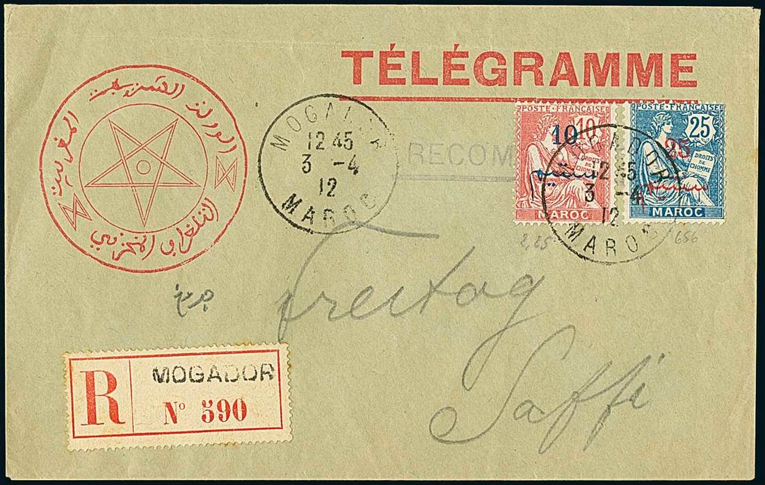 Telegrams, Telegraph & Telephone Stamps - The Professor Shaul Ladany Collection, Part IIFrench Colonies Morocco1912, April 3. Bilingual "Télégramme" envelope, registered from Mogador to Safi, bearing 19-11-17 10c. on 10c. and 25c. on 25c., backstamped on arrival. Scarce. Maury 29, 32. Photo