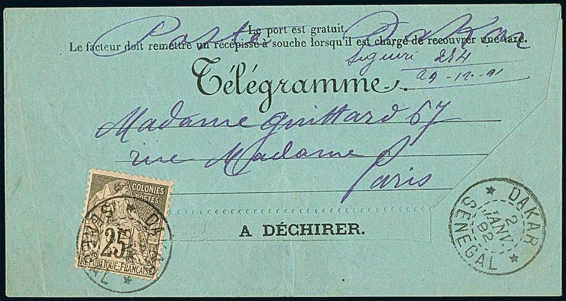 Telegrams, Telegraph & Telephone Stamps - The Professor Shaul Ladany Collection, Part IIFrench Colonies Senegal1892, Jan. 2. Folded telegram form from Dakar to Paris, bearing "Colonies Generales" 1881 25c. black on rose (torn on opening), tied on dispatch, with a further strike repeated at right. Mailed via the post since no cable had yet connected Senegal (Africa) with France. Very rare and attractive. Maury 54. Photo