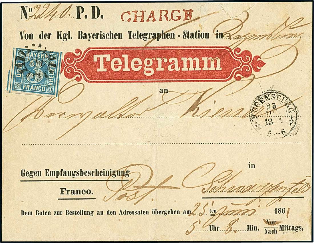 Telegrams, Telegraph & Telephone Stamps - The Professor Shaul Ladany Collection, Part IIGerman States Bavaria1858-62, 3kr. blue, plate II-5, just touched in part of the upper margin, otherwise large to huge margins showing part of a neighbouring adhesive at left, tied by cogwheel "418" to printed "Telegramm" envelope (very slightly reduced at top with small portion being patched, and back flap missing), addressed to Schwarzenfeld, correctly paying the 3 kreuzer postage required for a distance up to ten miles inland, showing red "Chargé" and "Regensburg" dispatch c.d.s. (25 June 1861) on front, backstamped on receipt. A very rare usage, of great visual impact for exhibition. Signed Pfenninger. Mi. 2II5. Photo