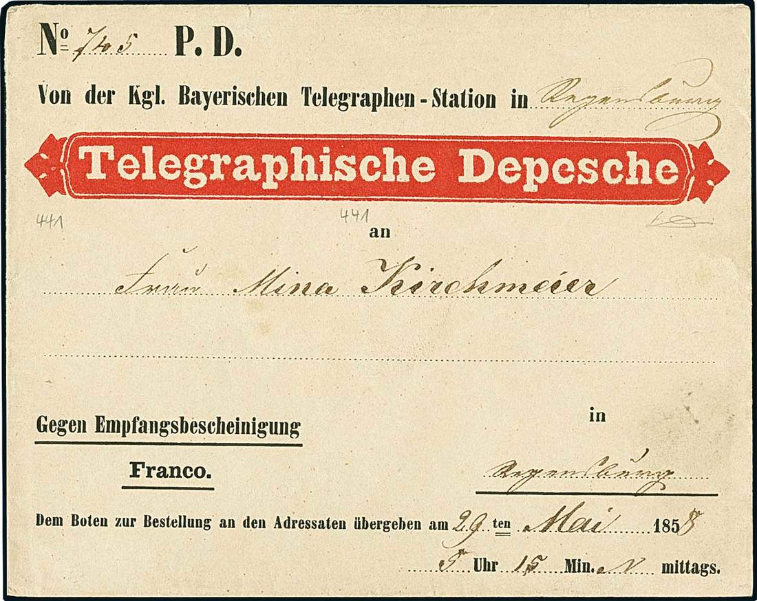 Telegrams, Telegraph & Telephone Stamps - The Professor Shaul Ladany Collection, Part IIGerman States Bavaria1858-90 ca., assembly comprising "Telegramm" (blue) envelope unused (edge imperfections), stampless used "Telegraphische depesche" from Regensburg, 1858 used telegram form headed with "Königlich Bayerische Staats-Telegraph" coat-of-arms; telegraph stamps with 1876 80pf. unmounted block of six with one stamp featuring paper repair prior to print, and two imperforate 28kr. / 1fr. & 20pf. reprints in sheets of 8 with wmk. of the 1891 telephone stamp. Photo