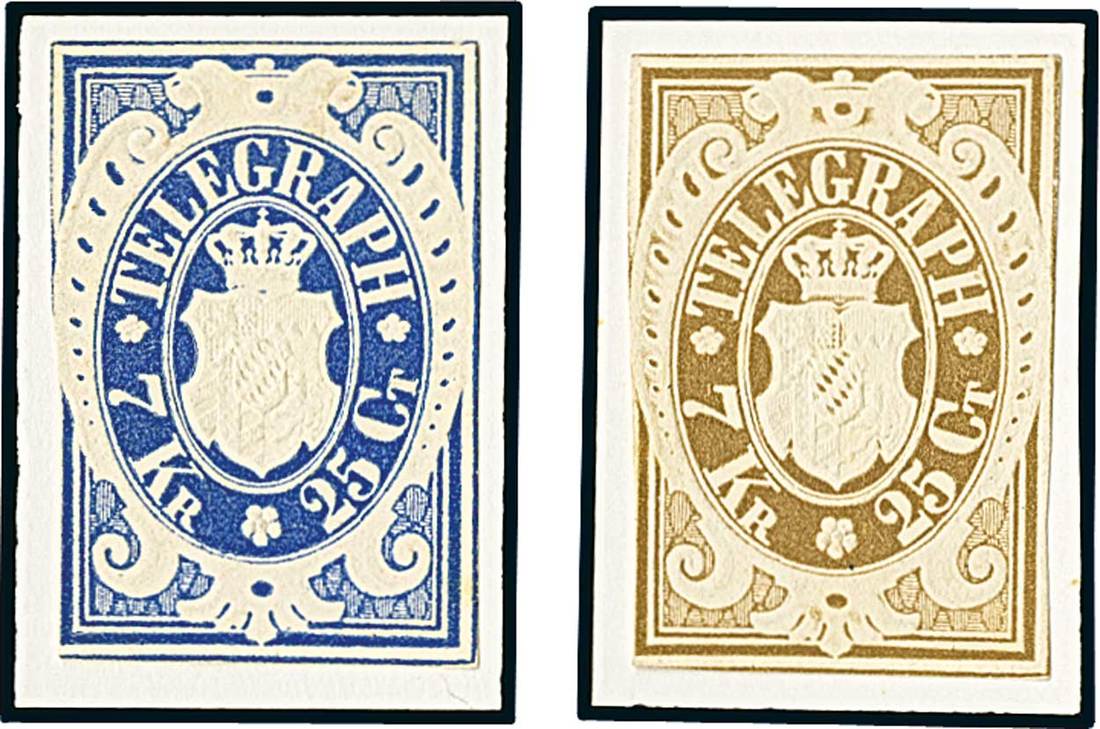 Telegrams, Telegraph & Telephone Stamps - The Professor Shaul Ladany Collection, Part IIGerman States BavariaTelegraph Stamps1870, two die proofs of the 7kr. / 25c. denomination, in different colours, blue and brown, and on wove white paper, with margins ranging from clear to slightly touched. A very scarce duo. Certs. Brettl, signed Pfenninger. Photo