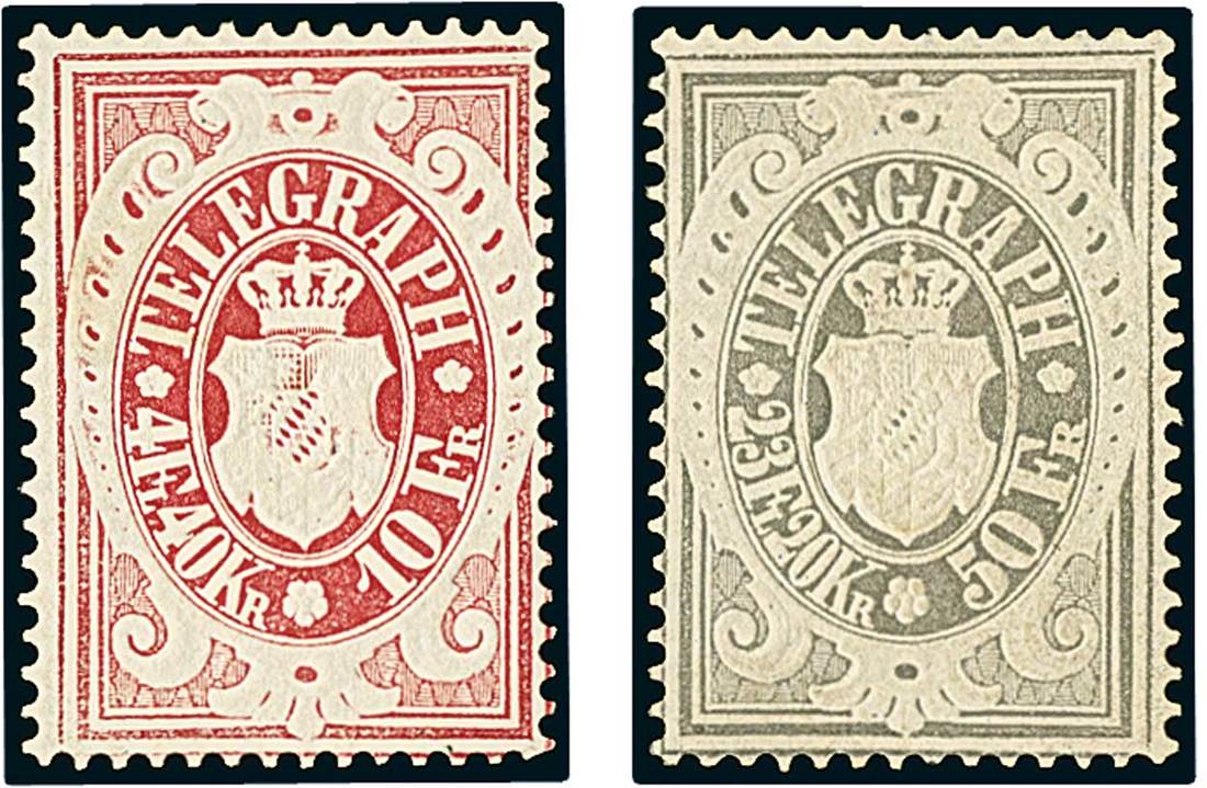 Telegrams, Telegraph & Telephone Stamps - The Professor Shaul Ladany Collection, Part IIGerman States BavariaTelegraph Stamps1870, ½sgr. to 23fl. 20kr. / 50fr., fresh complete set of eight values, exhibiting good perforations, all mint except for the 1fl. 24kr. denomination which is represented without gum (signed Pfenninger). The complete set of this issue is of great difficulty and desirability. Mi. 1-8. Photo