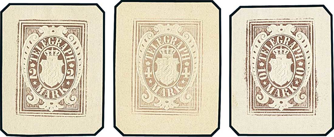 Telegrams, Telegraph & Telephone Stamps - The Professor Shaul Ladany Collection, Part IIGerman States BavariaTelegraph Stamps1876, 13 Die Proofs of issued denominations in various brownish- or greyish violet shades, including 20pf. (2), 25pf. (2), 40pf., 80pf., 1m., 2m. (2), 4m. (2), 10m. and 20m. all printed on laid paper including two (25pf. & 40pf.) affixed to brown cardboard. A magnificent and very rare assembly. Photo