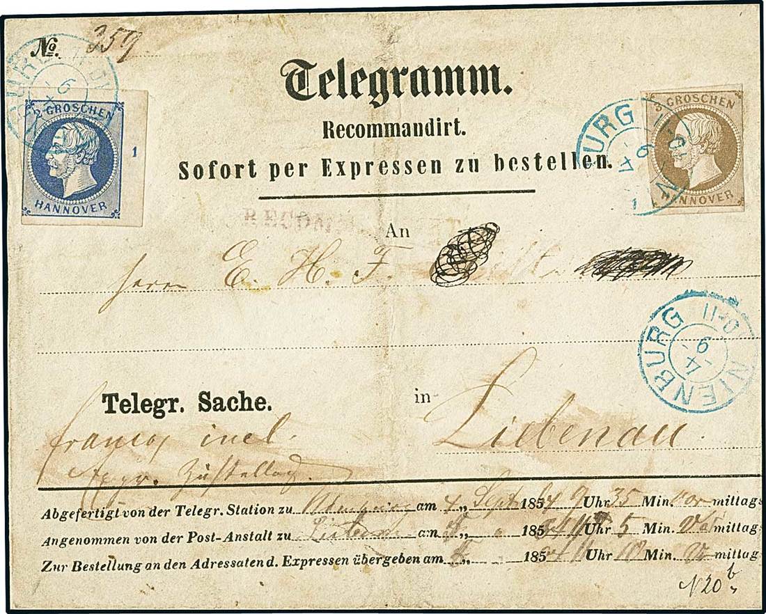 Telegrams, Telegraph & Telephone Stamps - The Professor Shaul Ladany Collection, Part IIGerman States Hanover1859-61, 2gr. dark blue, a marginal example with complete to huge margins, 3gr. brown, slightly cut into in two places, each tied by "Nienburg/4-9/10-11" in blue, used on telegram envelope showing "Recommandirt" straight-line in purple in centre. The 5 groschen rate includes 1 gr. for postage, 1 gr. for registration fee and 3 gr. for the express service. Several imperfections, barely detracting from one of the very few telegram covers recorded. Photo