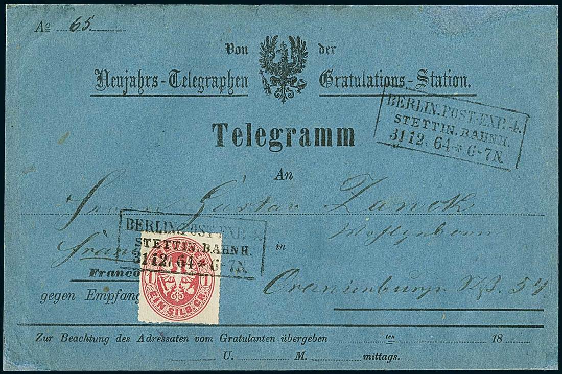 Telegrams, Telegraph & Telephone Stamps - The Professor Shaul Ladany Collection, Part IIGerman States PrussiaTelegraph Stamps1864, Dec 31. New Years's telegram envelope, including contents, from Berlin to Oranienburg, bearing 1sgr. rose-carmine tied by framed "Berlin.Post-Exp.4./Stettin.Bahnh./31.12-64*6-7N." datestamp, repeated alongside. A very rare item of delightful quality. Mi. 16. Photo