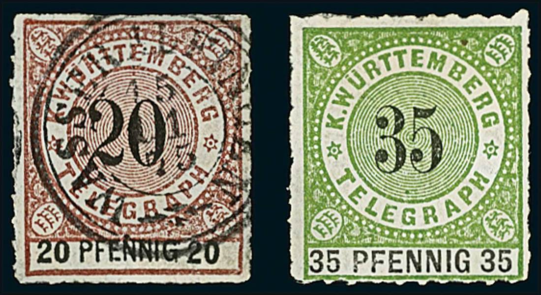 Telegrams, Telegraph & Telephone Stamps - The Professor Shaul Ladany Collection, Part IIGerman States WurttembergTelegraph Stamps1875-80, group of 24 adhesives, mainly used, with better examples including 1875 20pf. reddish brown used, and unissued 1876 35pf. Also regular 1881-83 2m. (2) & 5m. used with telegraph cancellations. Seven stamps present faults. Photo.