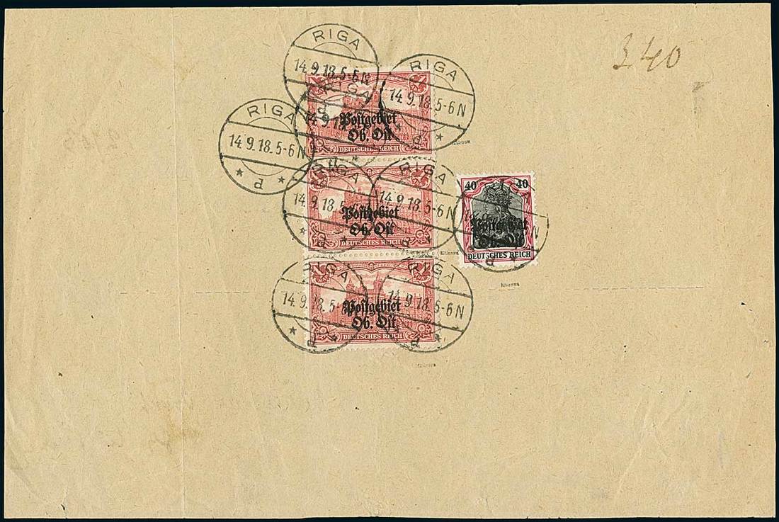 Telegrams, Telegraph & Telephone Stamps - The Professor Shaul Ladany Collection, Part IIGerman OccupationsLatvia1918, Sept. 14. Typed provisional telegram from Riga to Berlin, franked on reverse with overprinted "Postgebiet Ob. Ost" 40pf. and 1m. vertical strip of three, neatly tied by c.d.s.'s on departure showing, on front, two different cachets of "Stadthauptman Riga/Abteilung Polizei". A clean, most unusual document exhibiting an infrequently high and rare franking. Mi. 10, 12. Photo