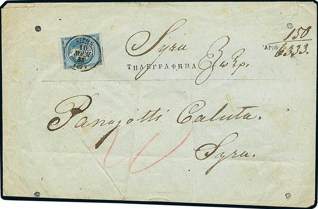 Telegrams, Telegraph & Telephone Stamps - The Professor Shaul Ladany Collection, Part IIGreece1868-69, 20l. blue, large margins on three sides, frame line missing at left, very fresh used on telegram cover delivered in Syros, tied by 10 November 1868 c.d.s. Folds or wrinkles, being of no importance for this rarity. One of at most three telegram covers recorded in the "Large Hermes Heads" issues, of great significance to illustrate different postal-history usages in an advanced exhibit. Karamitsos 27. Photo