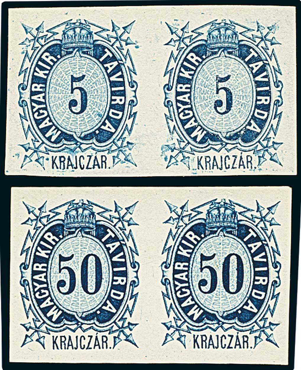 Telegrams, Telegraph & Telephone Stamps - The Professor Shaul Ladany Collection, Part IIHungaryTelegraph Stamps1874, engraved 5k. to 50k., set of six values, each represented in imperforate plate proofs in pair on white wove, ungummed, paper, exhibiting the original colour. A very rare group. Photo