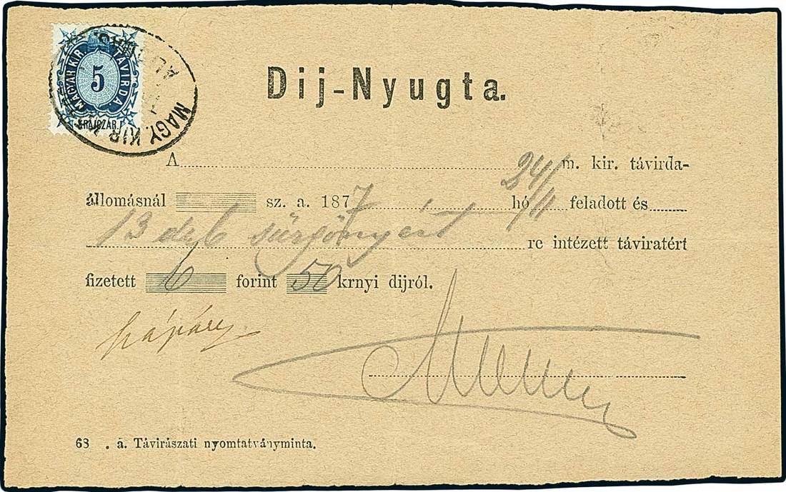 Telegrams, Telegraph & Telephone Stamps - The Professor Shaul Ladany Collection, Part IIHungaryTelegraph Stamps1874, engraved 5k. blue, very fresh example tied by telegraphic oval handstamp to receipt stating the fee (6ft. 50k.) paid for 13 telegrams. Telegraph stamps used on complete forms are extremely rare. Mi. 11. Photo