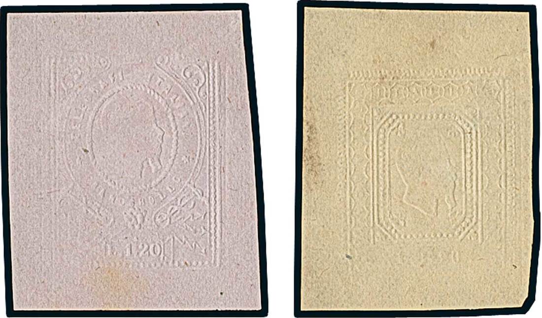 Telegrams, Telegraph & Telephone Stamps - The Professor Shaul Ladany Collection, Part IIItalyTelegraph Stamps1862 ca., eight essays, 1,20l. denomination featuring two different unissued designs displaying embossed printings with the profile of Vittorio Emmanuele II surrounded by oval or oblong frames, including five different coloured papers. An extremely rare group (to our knowledge, fewer than 50 examples are so far recorded). Some examples with faint tone spots. Photo