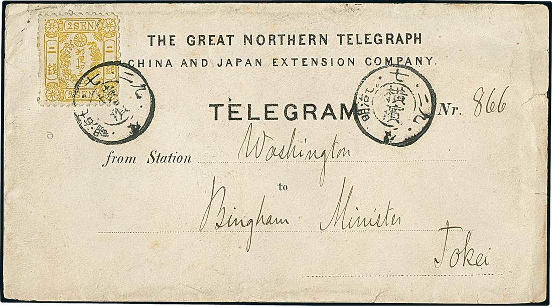 Telegrams, Telegraph & Telephone Stamps - The Professor Shaul Ladany Collection, Part IIJapan1874, 2s. yellow on ordinary wove paper, syllabic 4, tied by double circle c.d.s. on "The Great Northern Telegraph - China and Japan Extension Company" telegram envelope (small portion in corner missing, mentioned for accuracy), transmitting a message from Washington D.C. (United States), posted at Nagasaki and carried to Tokyo, showing red cachet of this telegraphic company at Nagasaki. Minor perforation imperfections, in no way detracting from this exceptionally rare usage on telegram cover in the classic period. JSCA V30; Scott 34. Ex Moser. Photo