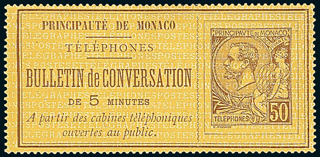 Telegrams, Telegraph & Telephone Stamps - The Professor Shaul Ladany Collection, Part IIMonacoTelephone Stamps1886, 50c. brown on yellow, two examples, one unused without gum, the other with corner-sheet margins used with special cachet. Yvert 1; € 1,145+. Photo
