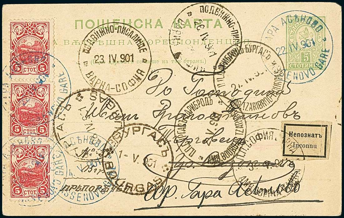 BulgariaLater Issues1901, April 22. "Small Lion" 5st. stationery card from Assenovo to Sizopol, additionally franked, for the registered fee, with three examples of 1901 "Uprising Against the Ottoman Empire" 5st., all tied by bilingual "Assenovo Gare" railway station c.d.s. on dispatch, undelivered as a result of indicating an unknown addressee following application of bilingual "Inconnue" label, which was also tied by one of the T.P.O.'s cancellations applied alongside, including the Varna-Sofia and Tsaribrod-Burgas routes, making up a spectacular front. Backstamped at Sizopol. The only mixed franking so far recorded including this issue, on complete cover, and properly paying the required rate; this issue also exists in mixed frankings with "Small Lions" on external mail, but without paying any portion of the rate, as the issue was not valid on mail sent abroad. Cert. Hitzler. Mi. 48. Photo