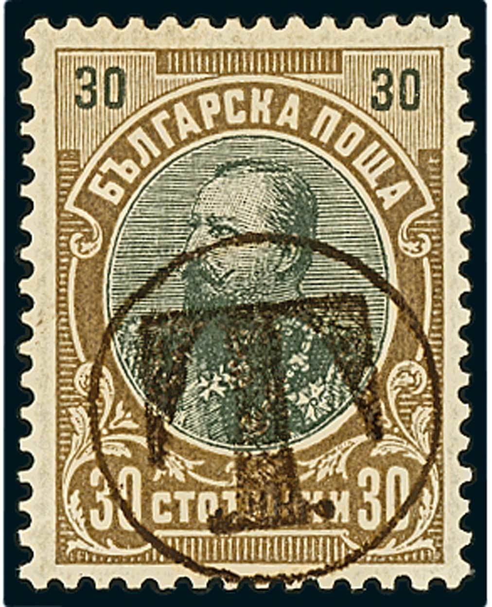 BulgariaLater Issues1901, 30 st. olive-brown and green-black, mint example with "T" within circle hand overprint, provisional postage due. These provisionals were issued in December 1901 in Ruse, and were not to be sold to the public; consequently genuine mint examples in private hands should be of extreme scarcity. This represents one of the very rare exceptions, being the only genuine recorded of this value. Signed Karaivanoff. Mi. 1e. Photo