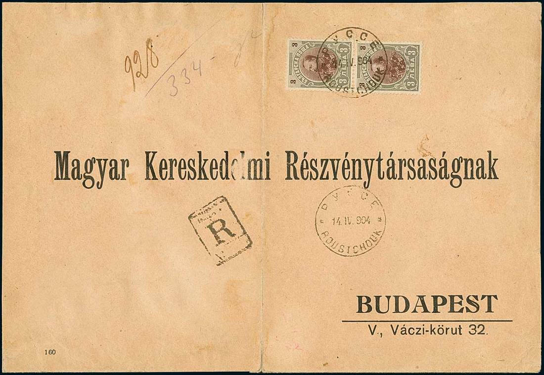 BulgariaLater Issues1904, April 14. Large commercial registered envelope from Ruse to Budapest, with 3l. vertical pair, 23 times paying the single postage and consequently not exceeding 345 grams (as confirmed by pencil note at top denoting 334 grams weight), tied by bilingual "Roustchouk" c.d.s. The highest franking so far recorded on cover, including the highest denomination, in this issue. Mi. 61. Photo
