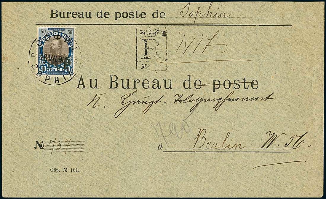 BulgariaLater Issues1901, "PCP" ("Par Certificate postale") overprint, 50st. on registered 18 July 1905 envelope (slightly reduced at top) sent to the telegraphic section of the Berlin Post Office, tied by bilingual "Sophia" c.d.s. Reverse with arrival c.d.s. and paper seal of the Berlin P.O. A rare and attractive usage. Cert. Hitzler. Ex Bustamante. Photo