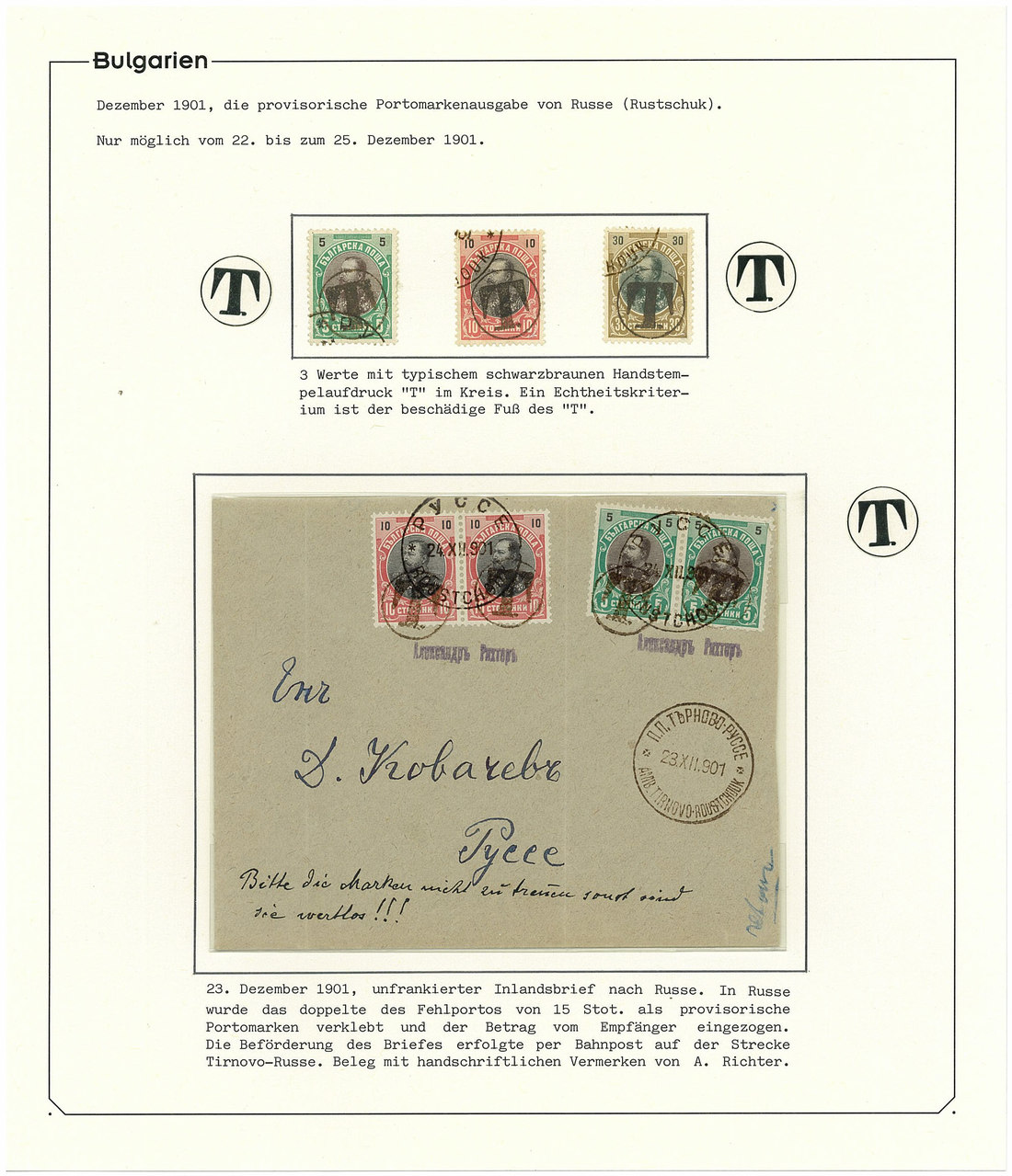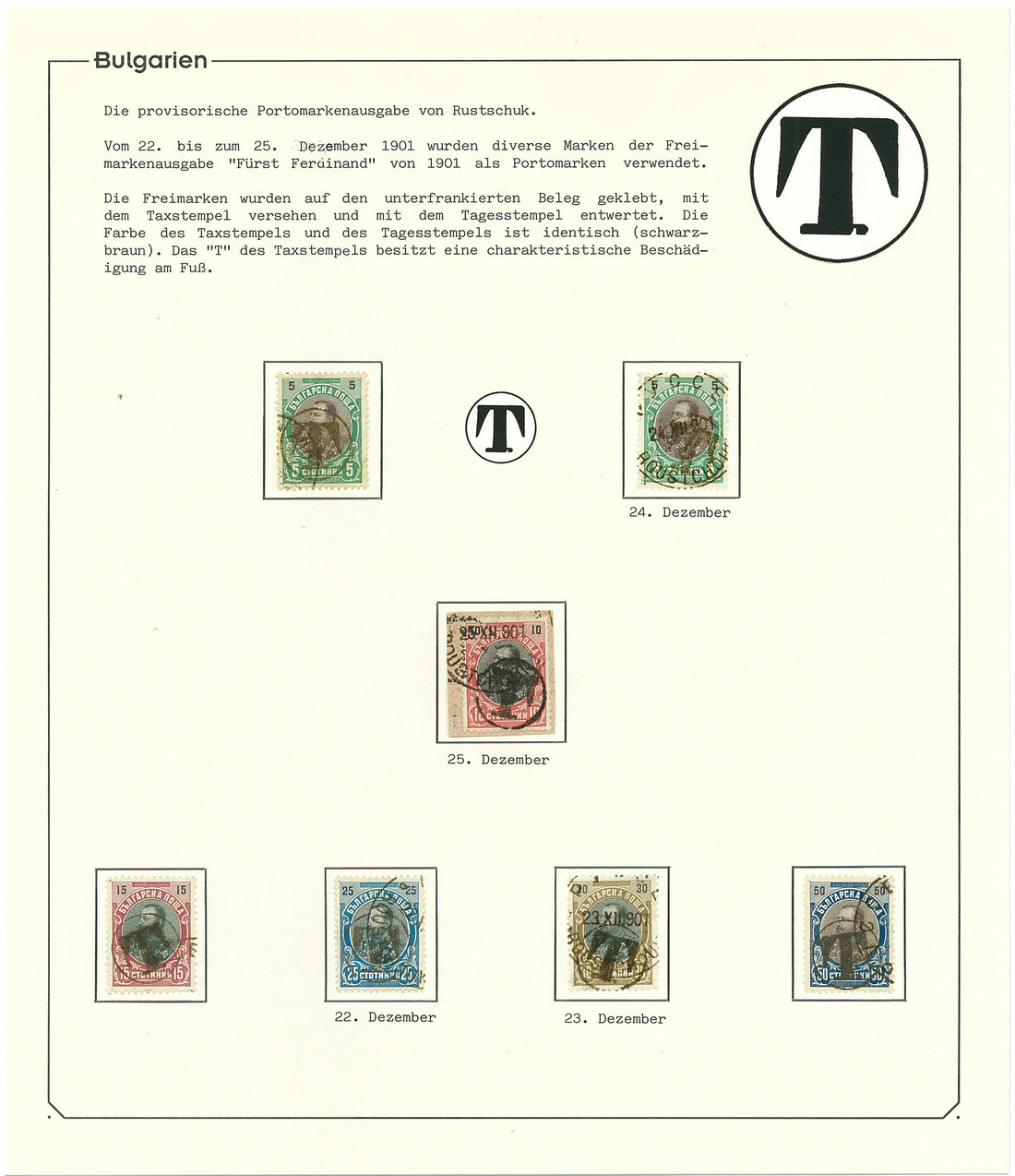 BulgariaLater Issues1901, 22-25 December, Provisional Postage Dues on "Prince Ferdinand". 5st., 10st., 15st., 25st. and 30st., nine used single values and one cover taxed with 5st. and 10st. pairs tied by bilingual "Roustchouk" c.d.s. with "Amb. Tirnovo-Roustchouk" c.d.s. adjacent (although being philatelic, genuinely travelled covers as this example are very rare). Mi. 1a-1e.