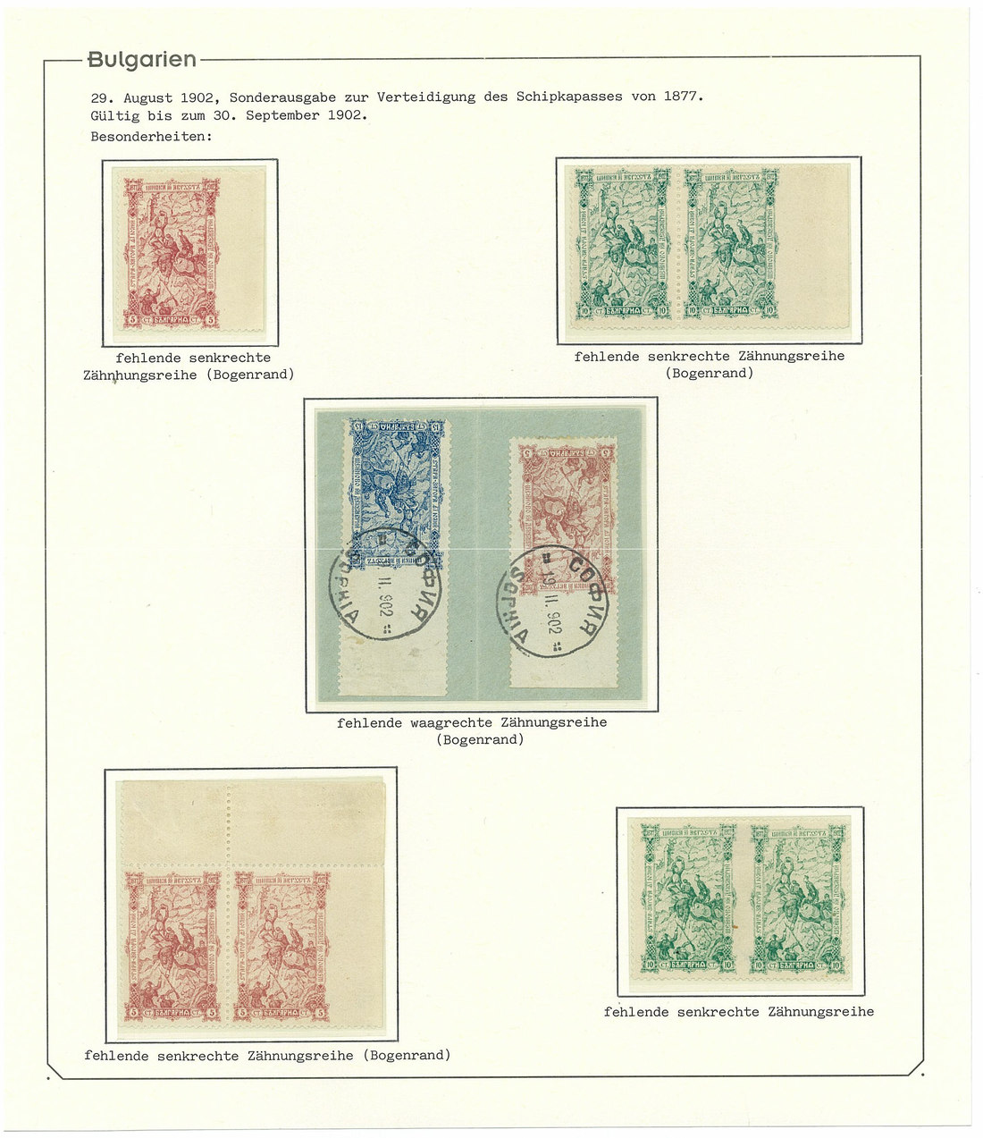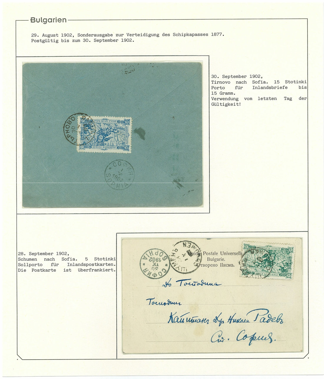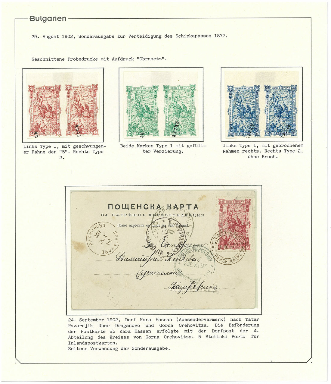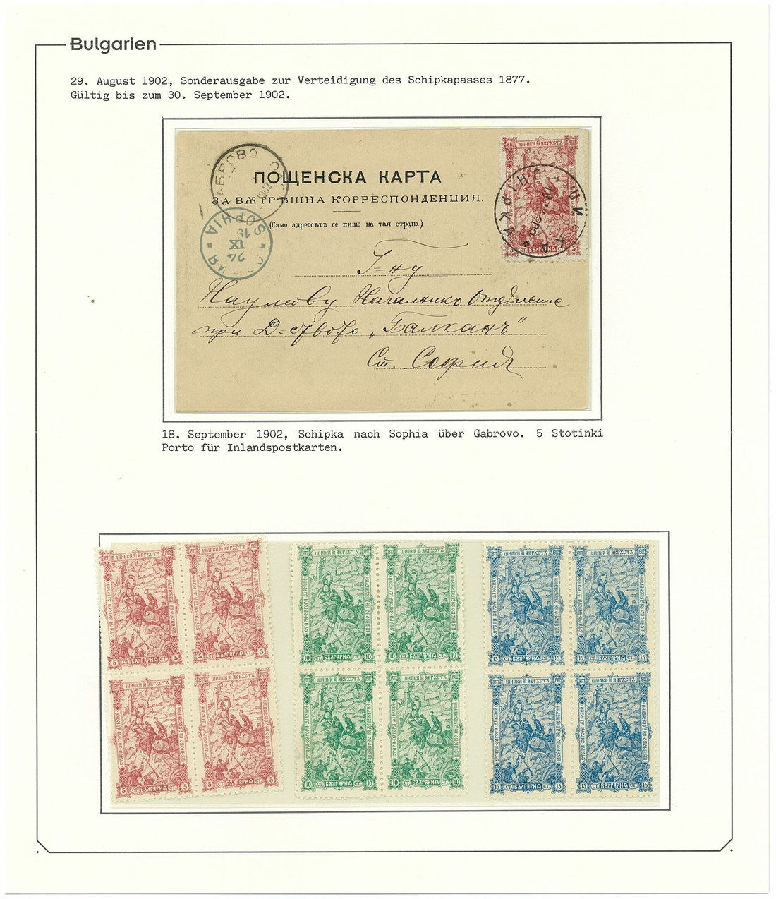 BulgariaLater Issues1902, Shipka Pass. Over 125 stamps with imperforate varieties, imperforate pairs with "Obrasetz" specimen overprints, multiples with 10st. part sheet of 50; and 10 covers/cards with mainly very scarce non-philatelic usages, including last day of validity, origin from small village, rare item from Sveti Nikola to Jambol with c.d.s.'s on dispatch, "Chipka" and "Scheinovo" and mixed frankings with 1901 Issue. A very fine and difficult group. Mi. 62-64. Photo