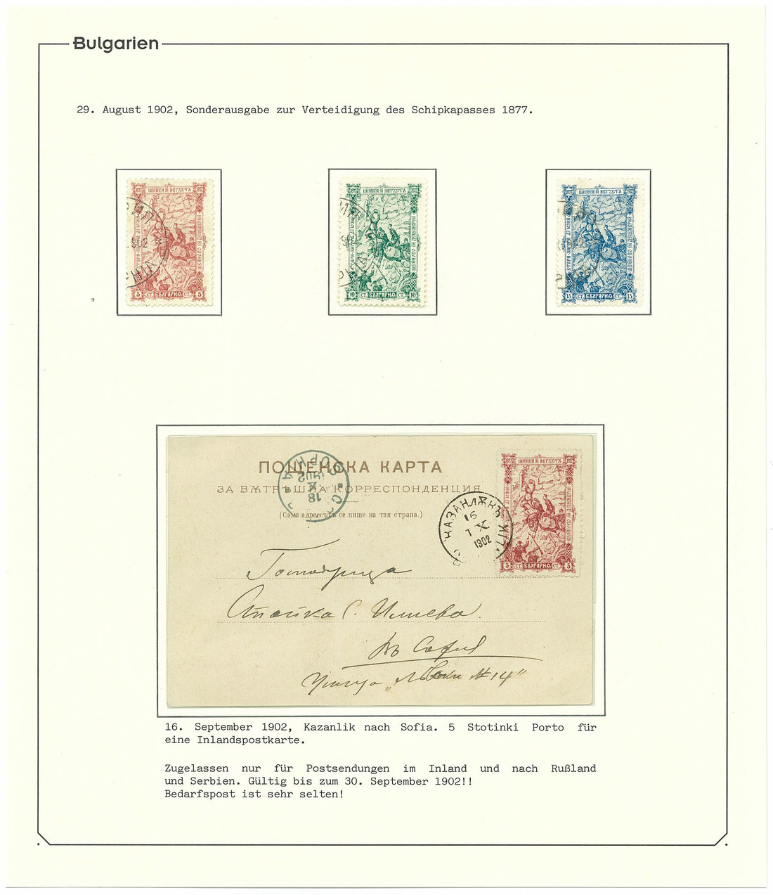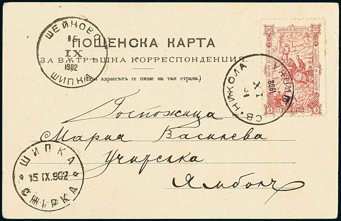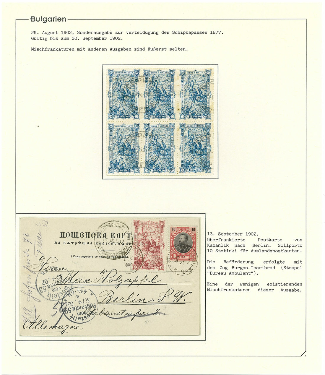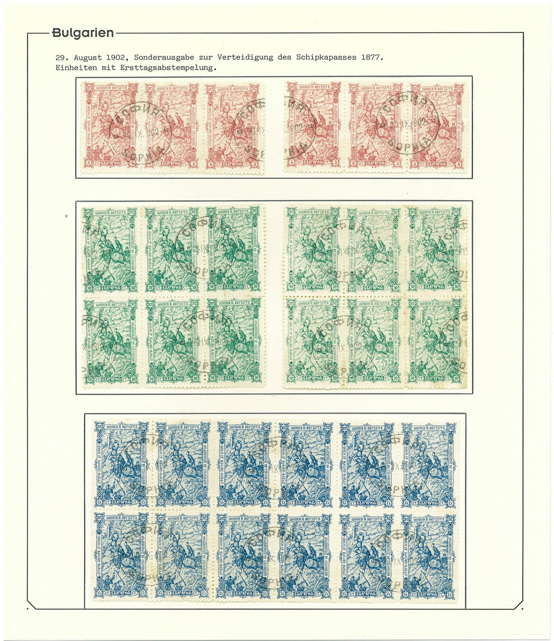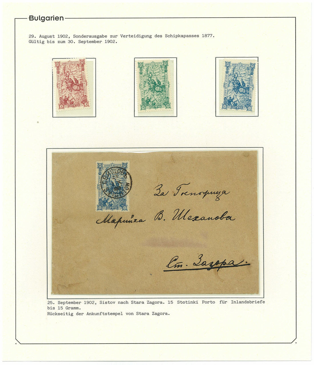 BulgariaLater Issues1902, Shipka Pass. Over 125 stamps with imperforate varieties, imperforate pairs with "Obrasetz" specimen overprints, multiples with 10st. part sheet of 50; and 10 covers/cards with mainly very scarce non-philatelic usages, including last day of validity, origin from small village, rare item from Sveti Nikola to Jambol with c.d.s.'s on dispatch, "Chipka" and "Scheinovo" and mixed frankings with 1901 Issue. A very fine and difficult group. Mi. 62-64. Photo