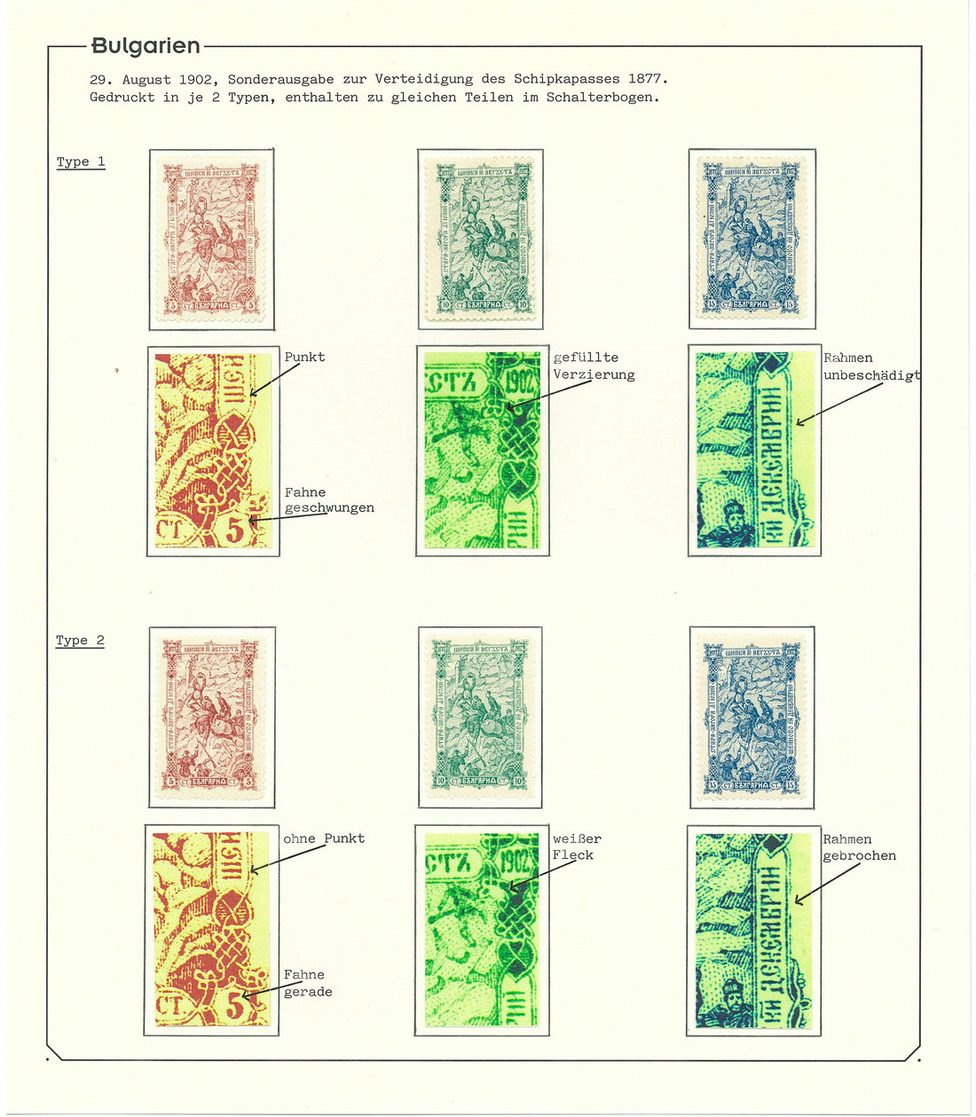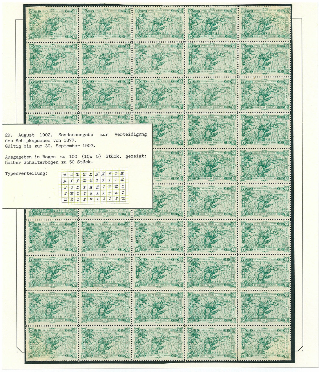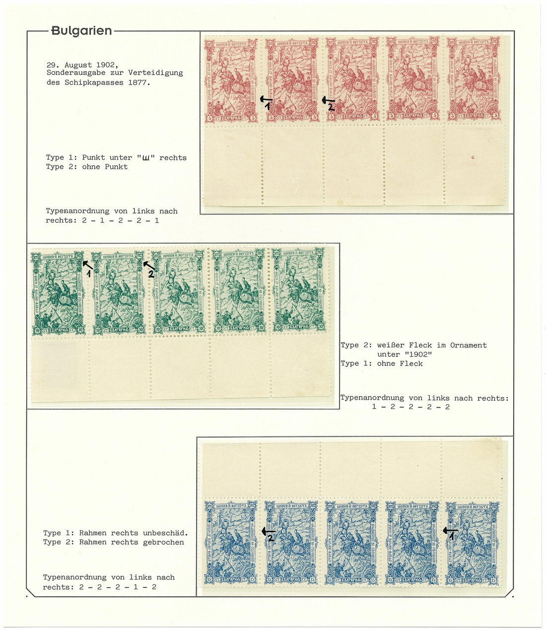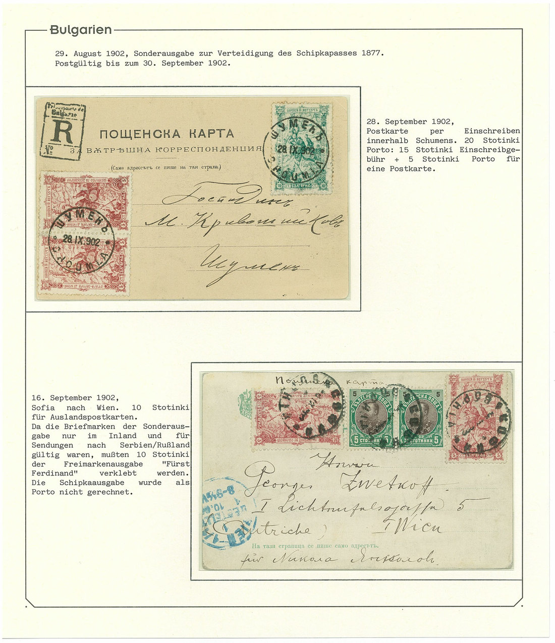 BulgariaLater Issues1902, Shipka Pass. Over 125 stamps with imperforate varieties, imperforate pairs with "Obrasetz" specimen overprints, multiples with 10st. part sheet of 50; and 10 covers/cards with mainly very scarce non-philatelic usages, including last day of validity, origin from small village, rare item from Sveti Nikola to Jambol with c.d.s.'s on dispatch, "Chipka" and "Scheinovo" and mixed frankings with 1901 Issue. A very fine and difficult group. Mi. 62-64. Photo