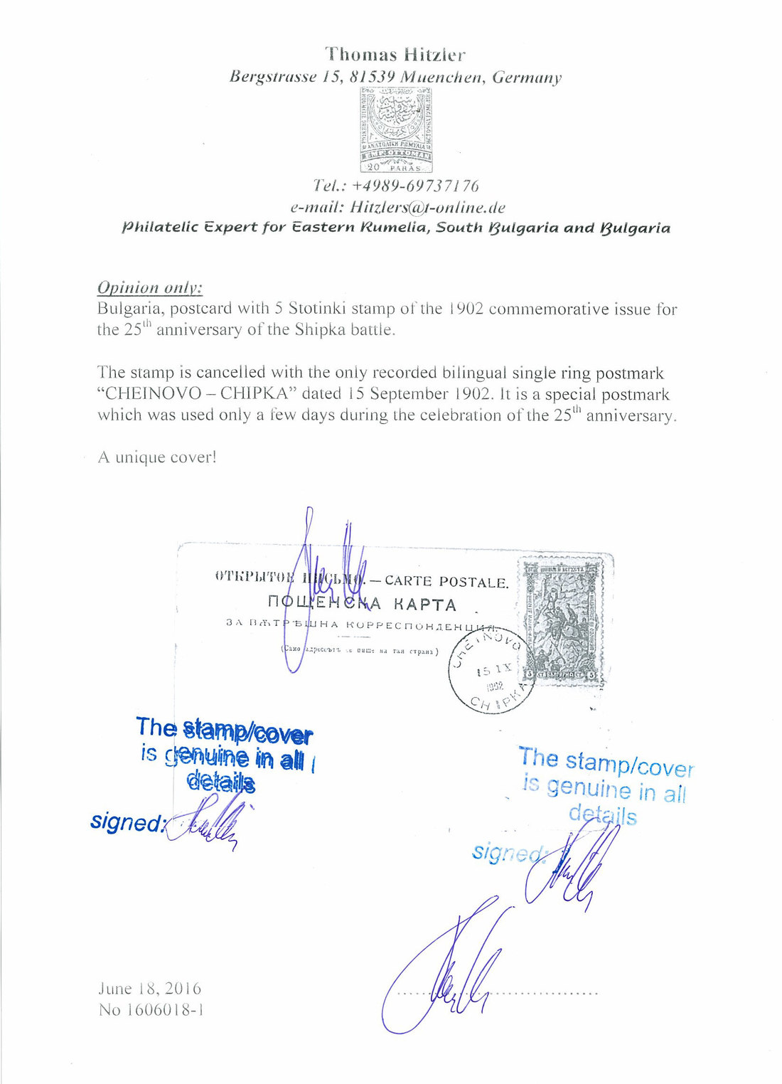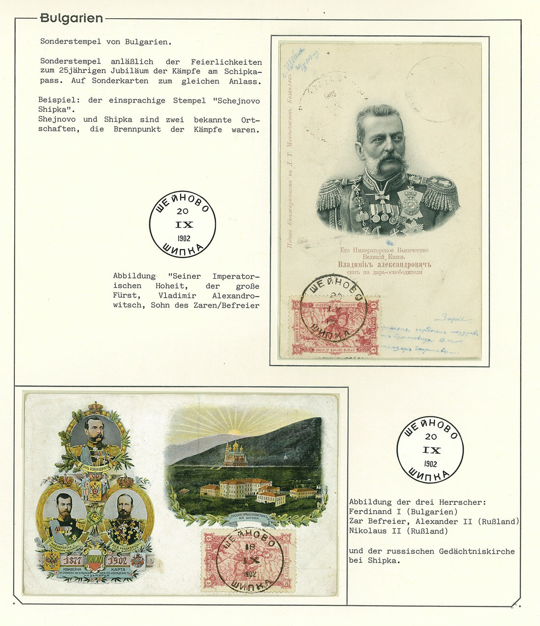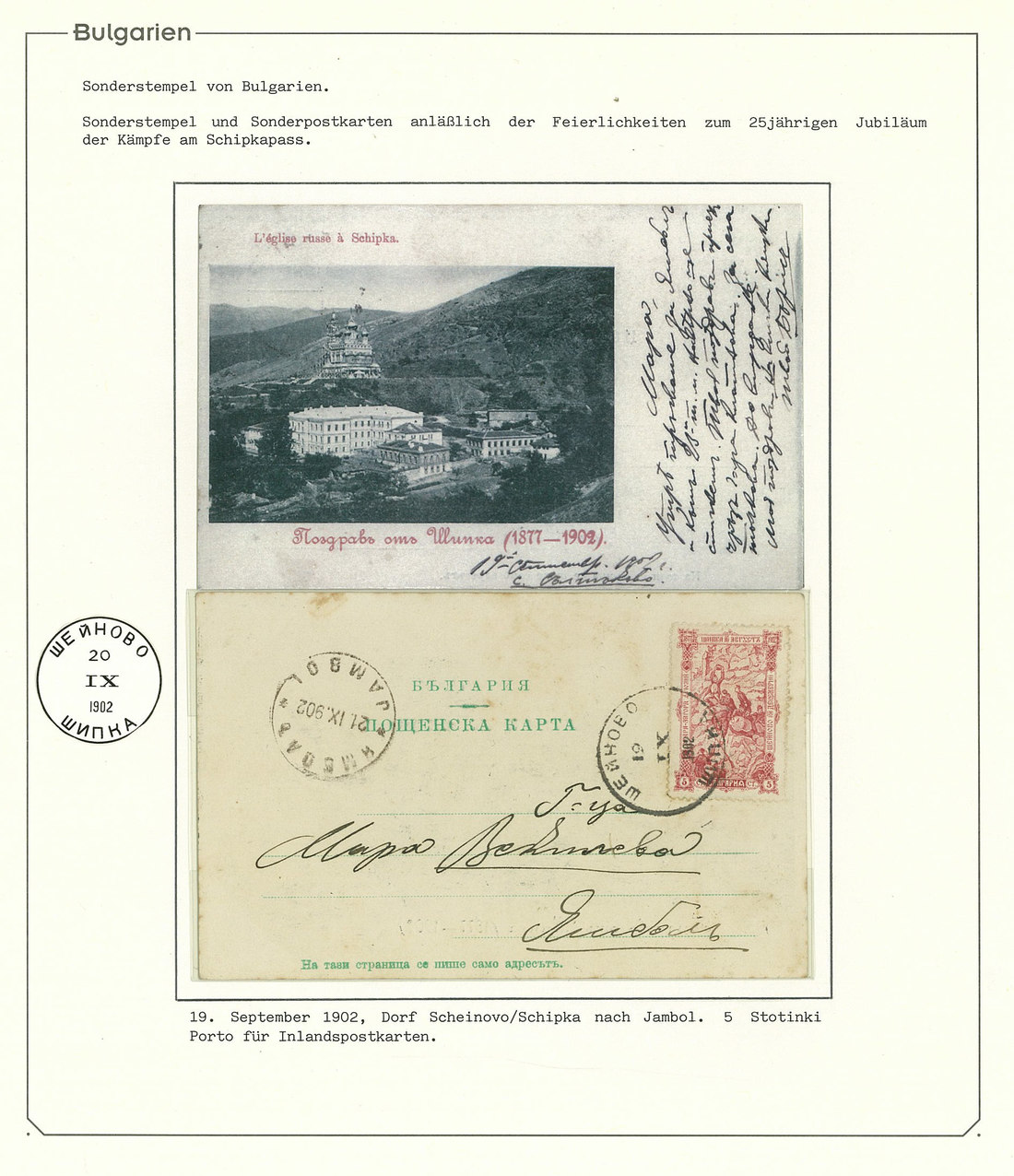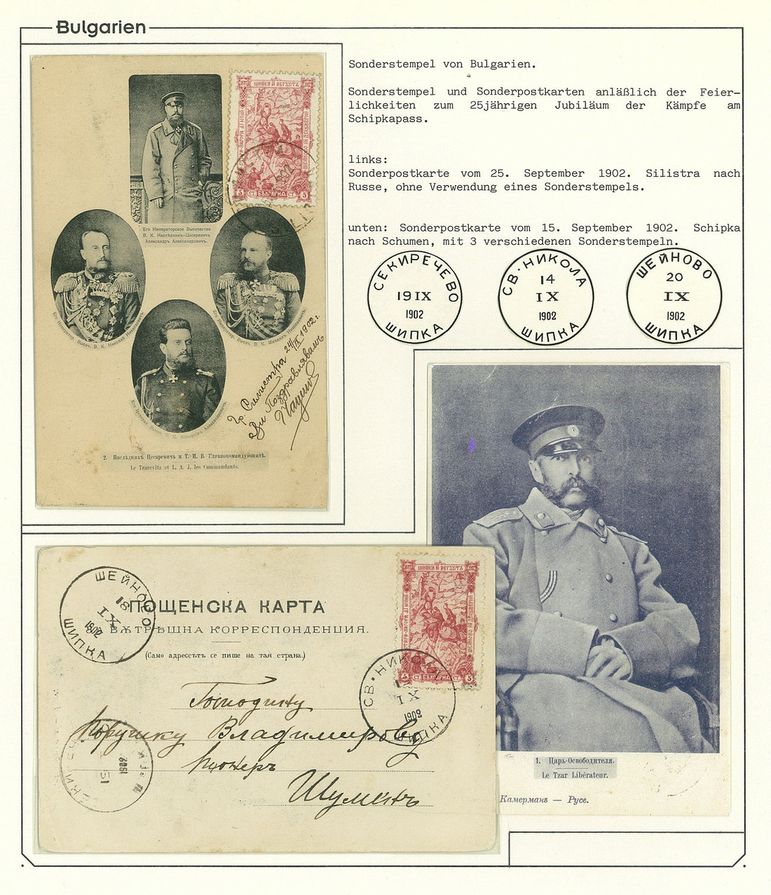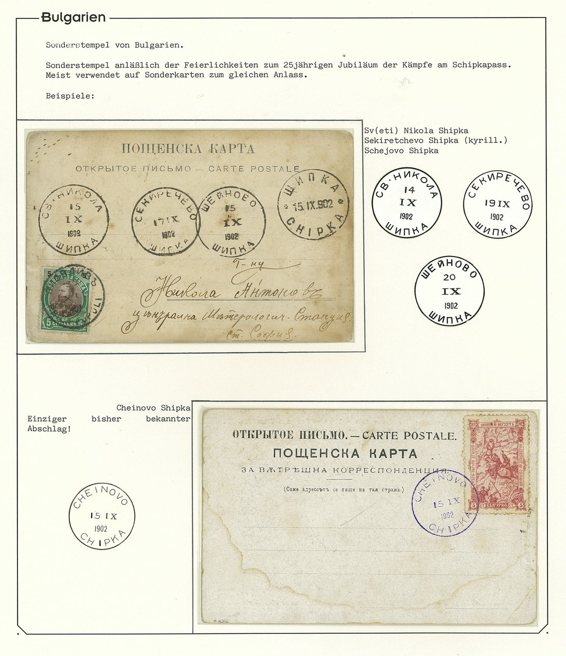 BulgariaLater Issues1902, Shipka Pass. The magnificent collection of 14 postcards showing the commemorative cancellations used during only about one week to celebrate the Battle of Shipka Pass, including the only example recorded of the "Cheinovo-Chipka" postmark (Hitzler certificate). A unique assembly. Photo