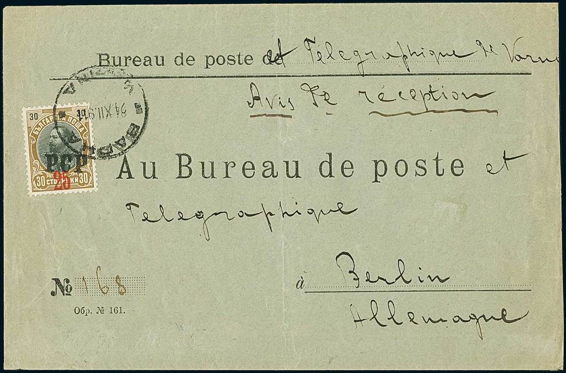 BulgariaLater Issues1909, "PCP" ("Par Certificate postale") overprint, 25 on 30st. tied by bilingual "Varna" c.d.s. on registered 24 december 1912 envelope sent to the telegraphic section of the Berlin Post Office. A rare usage, further enhanced by the infrequent origin. Cert. Hitzler. Photo