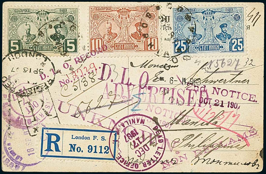 BulgariaLater Issues1907, Aug. 31. Registered postcard from Sofia to Manila (Philippines), bearing 1907 5st., 10st. and 25st., complete set, tied by c.d.s. on dispatch, showing numerous handstamps (six different) for unclaimed and returned mail via Dead Letter Office, and London transits with datestamp and registration label, arriving to Sofia on 6.2.1908. A spectacular exhibition item sent to a most unusual destination, unique thus. Cert. Hitzler. Mi. 66-68. Photo