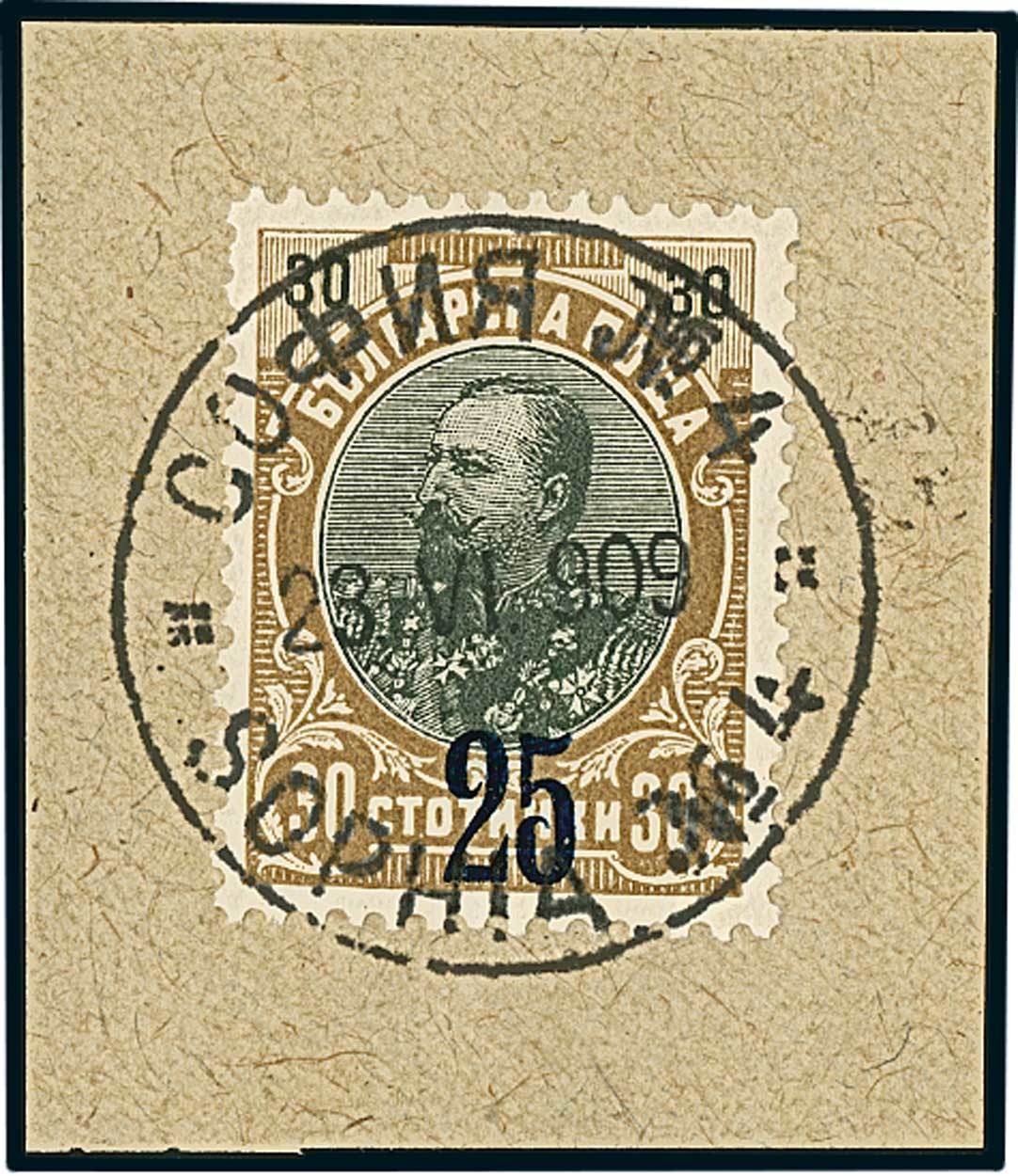 BulgariaLater Issues1909, "25" in dark blue instead of red, on 30st. olive-brown and green-black, tied to piece by "Sophia N°4" c.d.s. Only three fragments recorded with this variety. Mi. 70F; € 600+. Photo