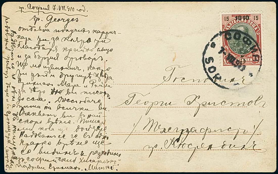 BulgariaLater Issues1910, "5" and "1910" in black instead of bluish black on 15st., tied by bilingual "Sophia/7.VII.910" c.d.s. on postcard to Kustendil. The only example recorded of this variety on cover. Popov 77PR1. Photo
