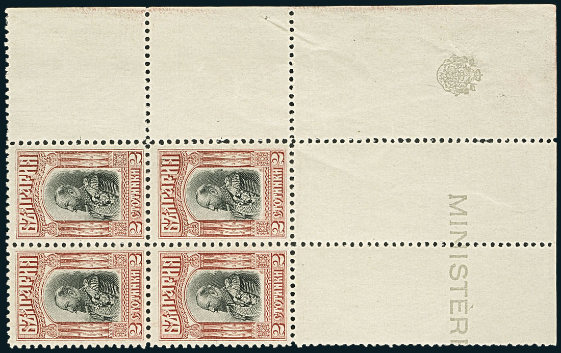 BulgariaLater Issues1911-15, Tsar Ferdinand, 2st. lilac-red and black, block of four from the lower right margin of the sheet, showing Arms and "Ministèr..." imprint at base, never hinged. A spectacular multiple featuring this scarce shade. Mi. 79b.