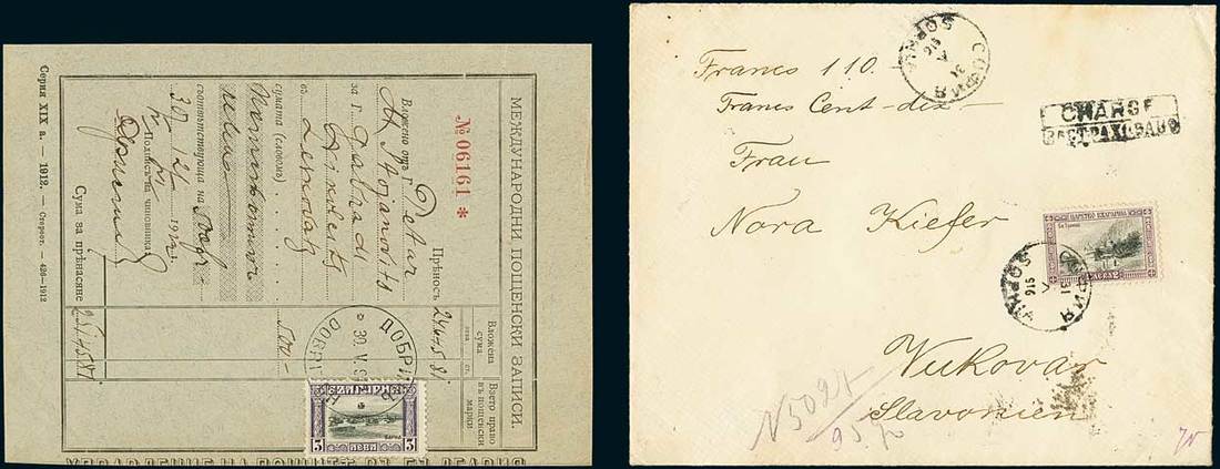 BulgariaLater Issues1911-15, 2l. Monastery of Holy Trinity and 3l. View of Varna, each used as single franking on two postal documents. Including 1916 insured cover to Vukovar (Slavonia) with 2l., with the rate being made up of 25st. registration fee, 1,25l. quintuple rate up to 100 grams and 50st. for insurance as confirmed by "Francs 110"; 1912 external money order form for 500 gold francs, from Dobritch to Serbia, franked by 3l. The only covers so far recorded bearing these single frankings and correctly paying the rate. Mi. 88, 89. Photo