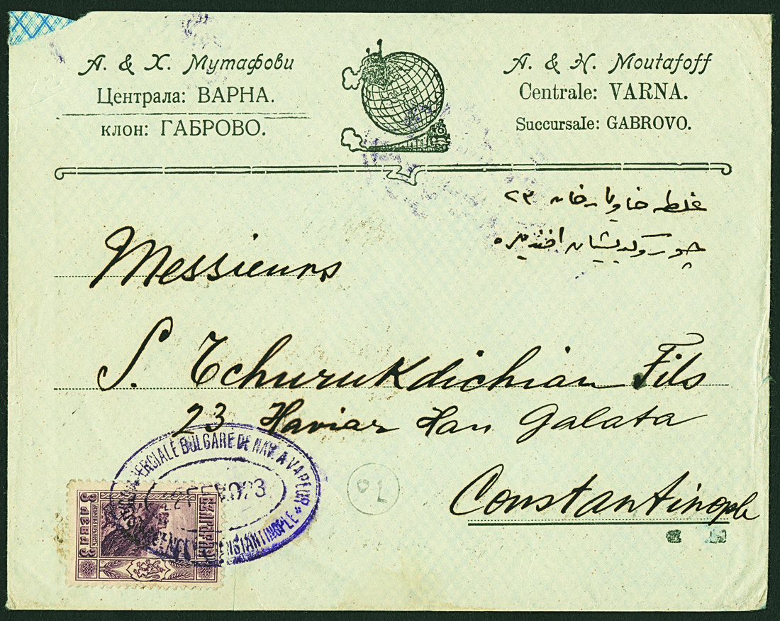 BulgariaMaritime MailBulgarian Maritime Mail1922, Feb. 22. Commercial cover from Varna to Constantinople, bearing 1911 3l. tied by violet "S. Commerciale Bulgare Nav. a Vapeur/Agence de Constantinople" oval datestamp, backstamped on arrival. To our knowledge, the only usage recorded of this postmark on cover. Mi. 89.
