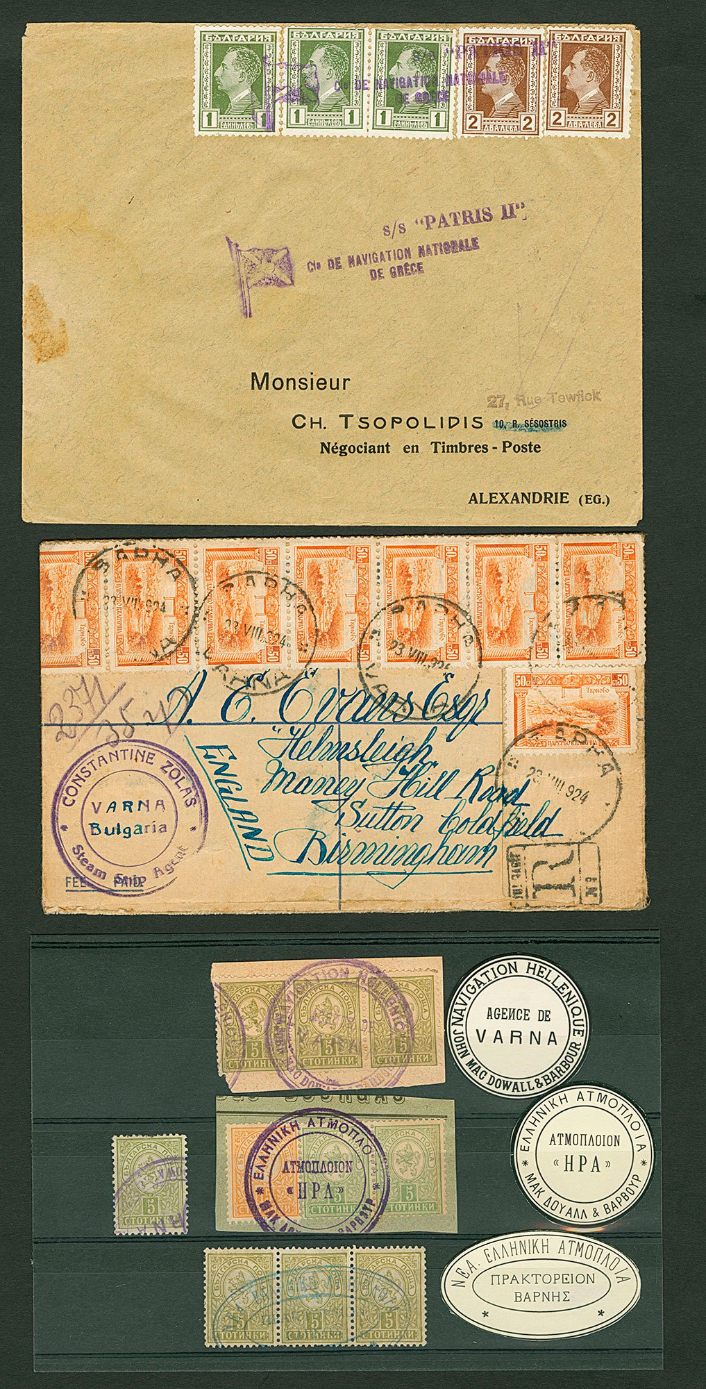BulgariaMaritime MailGreek Ship Mail1933. Cover with Bulgarian franking tied by extremely rare "ss Patris II/Cie de Navigation Nationale/De Grêce" three-line handstamp with flag, 1924 registered envelope with "Constantine Zolas/Varna Bulgaria/Steam Ship Agent" cachet, and "Small Lions" frankings on pieces with three different and rare postmarks.