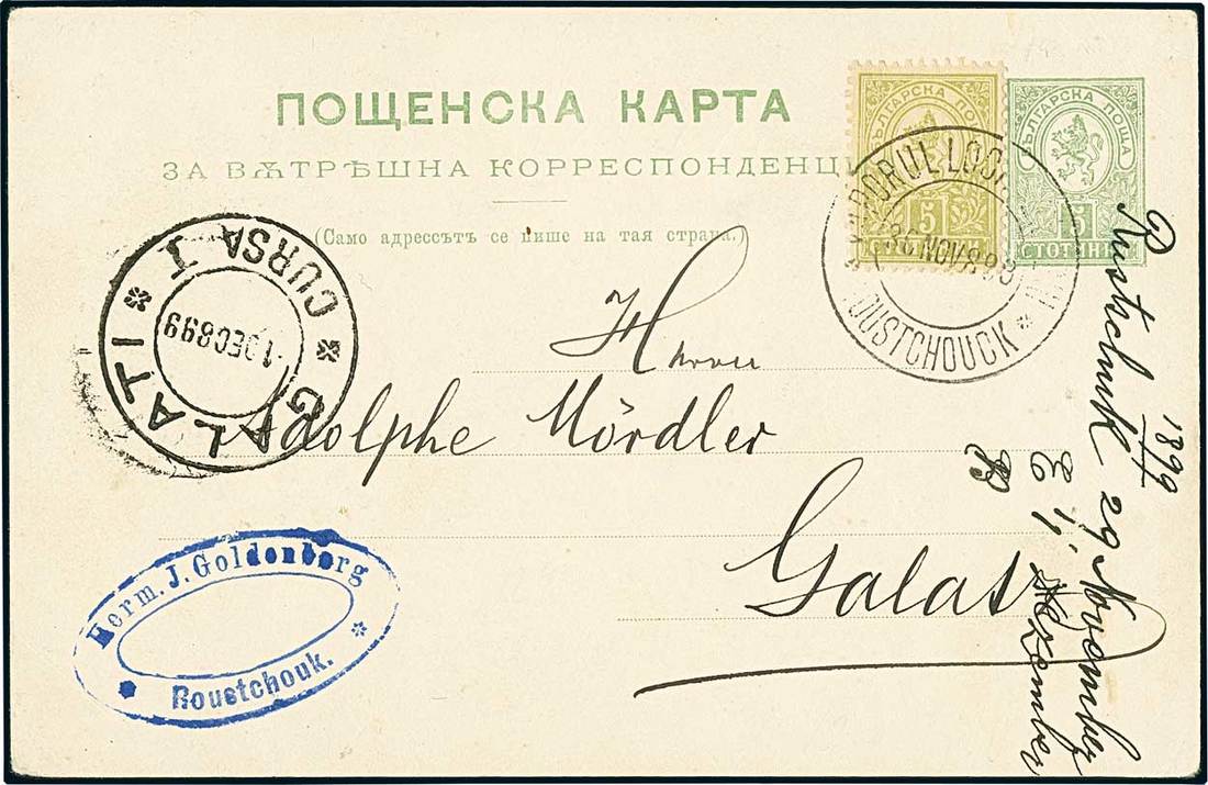 BulgariaMaritime MailRomanian Ship Mail1899, Nov. 29. "Small Lion" 5st. green postal stationery envelope from Ruse to Galatz (Romania), correctly uprated for the external rate with 5st. adhesive of the same issue, tied by "Vaporul Local Giurgiu/Roustchouck" c.d.s., which was used by Romanian steamships carrying mail across the Danube both ways from Romania to Bulgaria; the Giurgiu-Ruse route was covered by Romanian steamships from 1894 to 1916, these being the "T. Magurele" and the "Giurgiu". Of the just three items known exhibiting a combination with Bulgarian stamps, this is the finest. Cert. Hitzler. Mi. 31. Photo