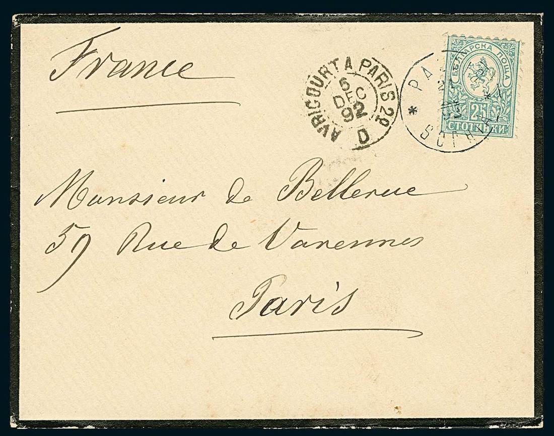 BulgariaPalace Mail1892-98. Mourning cover to Paris with embossed crown on reverse, with "Small Lion" 25st. tied by small "Palais/Sophia" c.d.s. in black, and registered envelope to Dresden (Germany) with intact red wax seal of the Direction of the Scientific Library and Institutions of the Prince of Bulgaria, with "Small Lions" 25st. pair tied by "Sofia/Palais" c.d.s. with fleurs-de-lis. Mi. 34. Photo