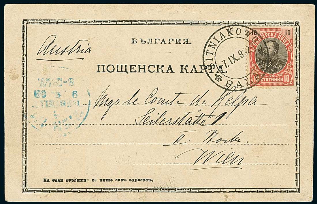 BulgariaPalace Mail1912, March 24. Postcard to Vienna displaying 1901 10st. tied by superb "Sitniakowo/Palais" c.d.s., with arrival at left. Very rare. Mi. 54. Photo