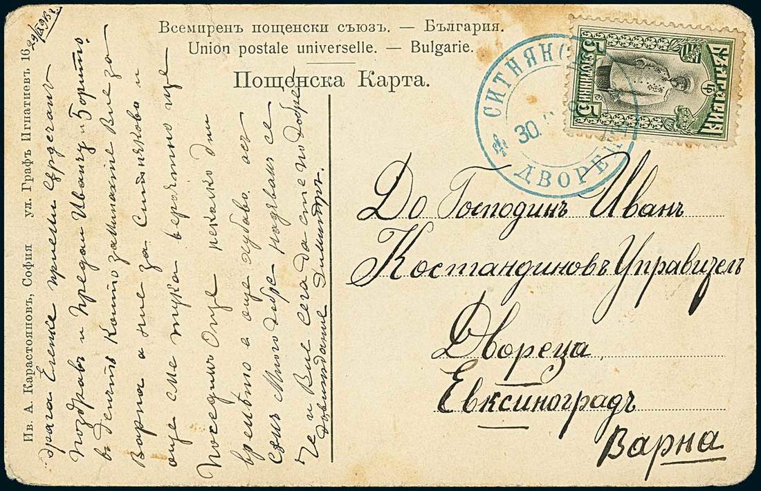 BulgariaPalace Mail1913, Sept. 30. Postcard (small tear at top left) to Varna, franked by 1911 5st. tied by neat blue "Sitniakovo/Palais" datestamp in cyrillic. Less than five items known with this cancel in blue. Cert. Hitzler. Mi. 81. Photo