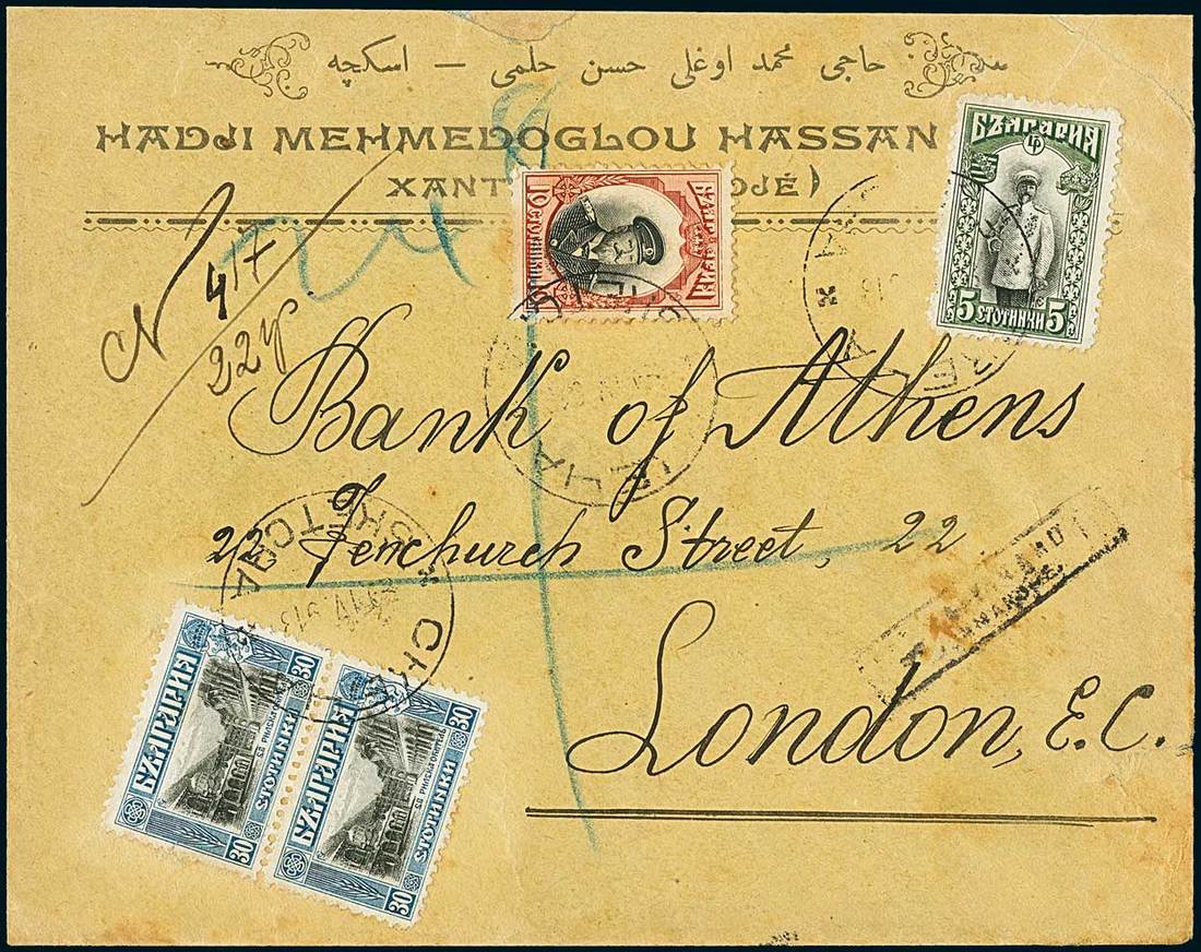 BulgariaThe Balkan Wars1913, April 9. Registered cover from Sketcha (Xanthi in Greek) to London, dispatched during the Bulgarian occupation of Eastern Macedonia, franked at double rate with 1911 5st., 10st. and 30st. pair, tied by bilingual "Sketcha" c.d.s.'s, with Bulgarian "Soloun" (Salonika) and arrival datestamps on back. A very rare datestamp. Cert. Hitzler. Mi. 81, 82, 85. Photo