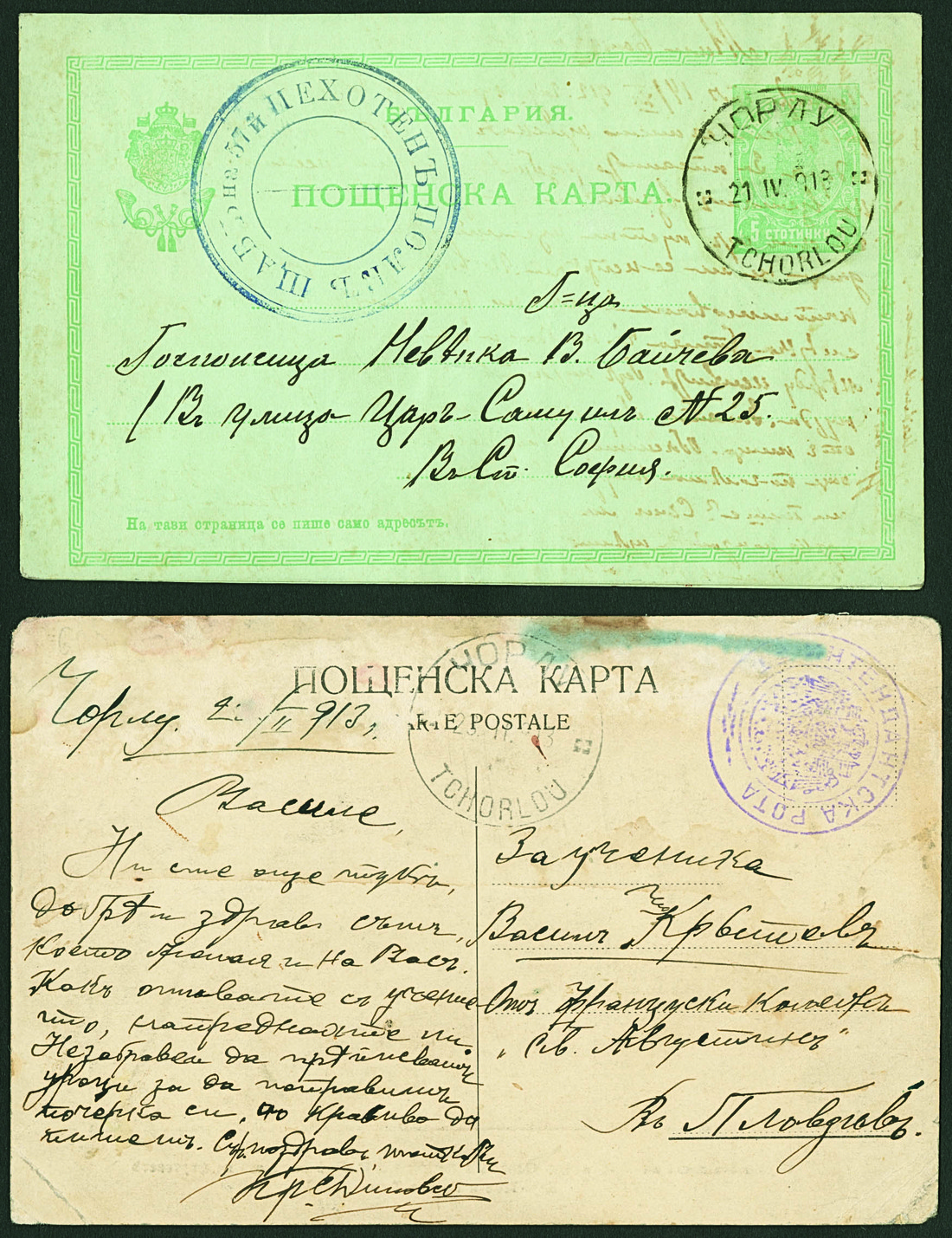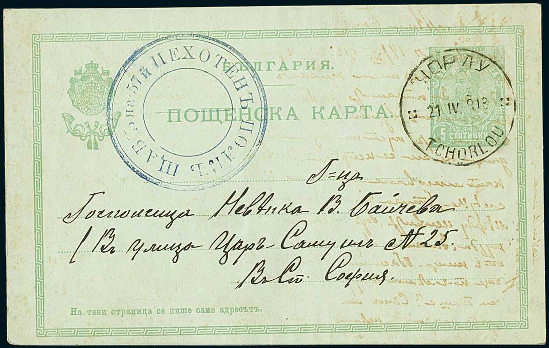 BulgariaThe Balkan Wars1913, Feb-April. Free frank postcard to Plovdiv with military cachet and 5st. stationery card to Sofia struck by handstamp of the 57 Infantry regiment, both showing fine "Corlu/Tchorlou" datestamps of the Bulgarian occupation in Turkey. A very scarce cancellation. Photo