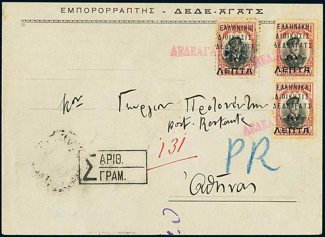 BulgariaThe Balkan Wars1913, Aug. Commercial registered envelope to Athens during the Greek Occupation of Dedeagach, franked by 10l. on 10st. pair and single, correctly paying the rate and tied by rose-red "Dedeagatch" straight-line handstamp in Greek, backstamped on receipt. A very fine example of the rare mail during the Greek occupation. Karamitsos 2. Ex Kohane. Photo