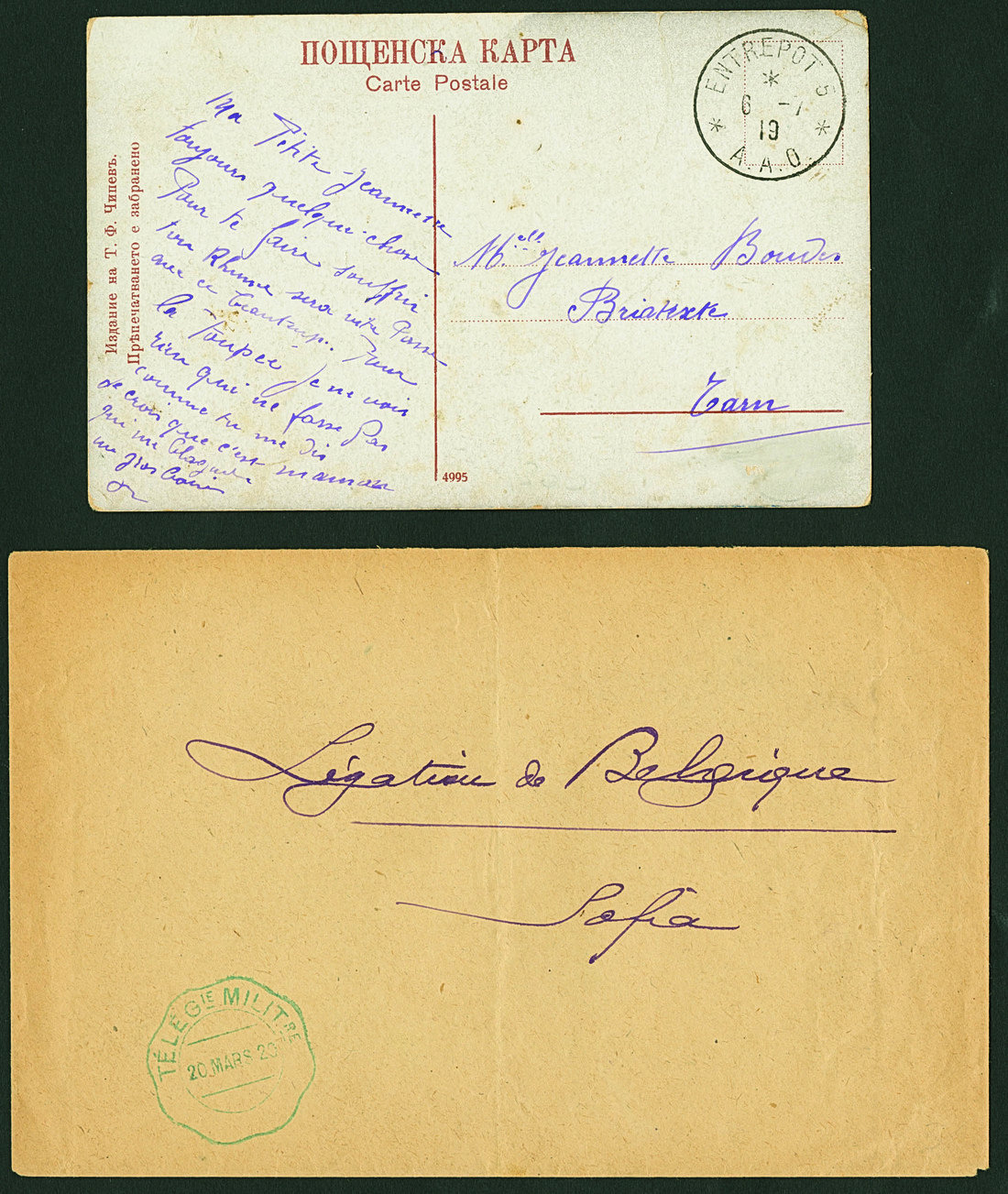 BulgariaThe World Wars1919, March-July, cover with very rare blue "Télégie. Militre" datestamp and postcard with scarce "Entrepot 5/A.A.O." c.d.s.