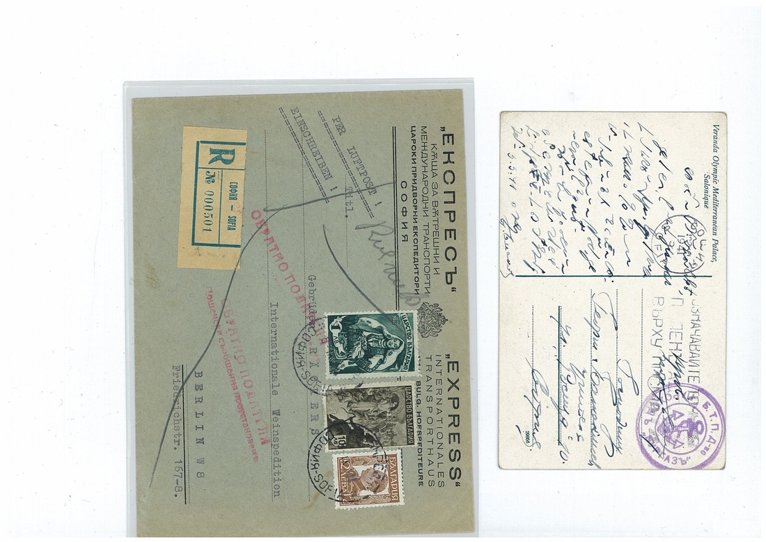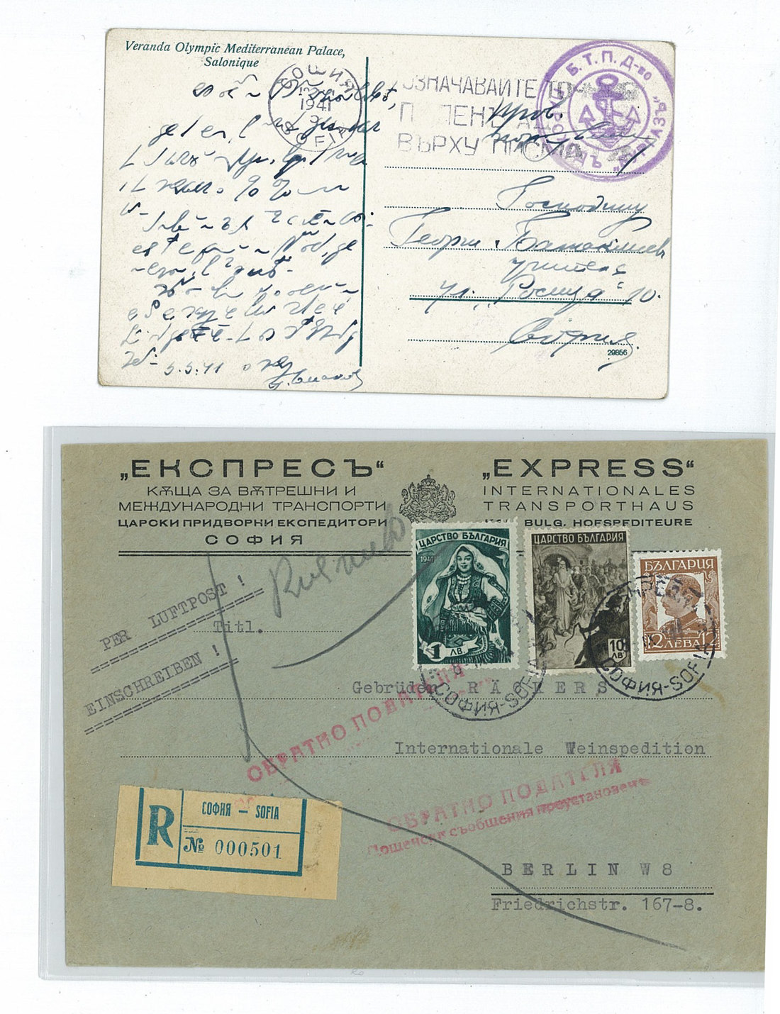 BulgariaThe World Wars1941-45, postcard from Greece during the Bulgarian occupation sent by a soldier at Salonika and bearing Bulgarian maritime cachet of the SS "Burgas", as well as cover dispatched at Sofia during the liberation in 1945 but not travelled due to war events.