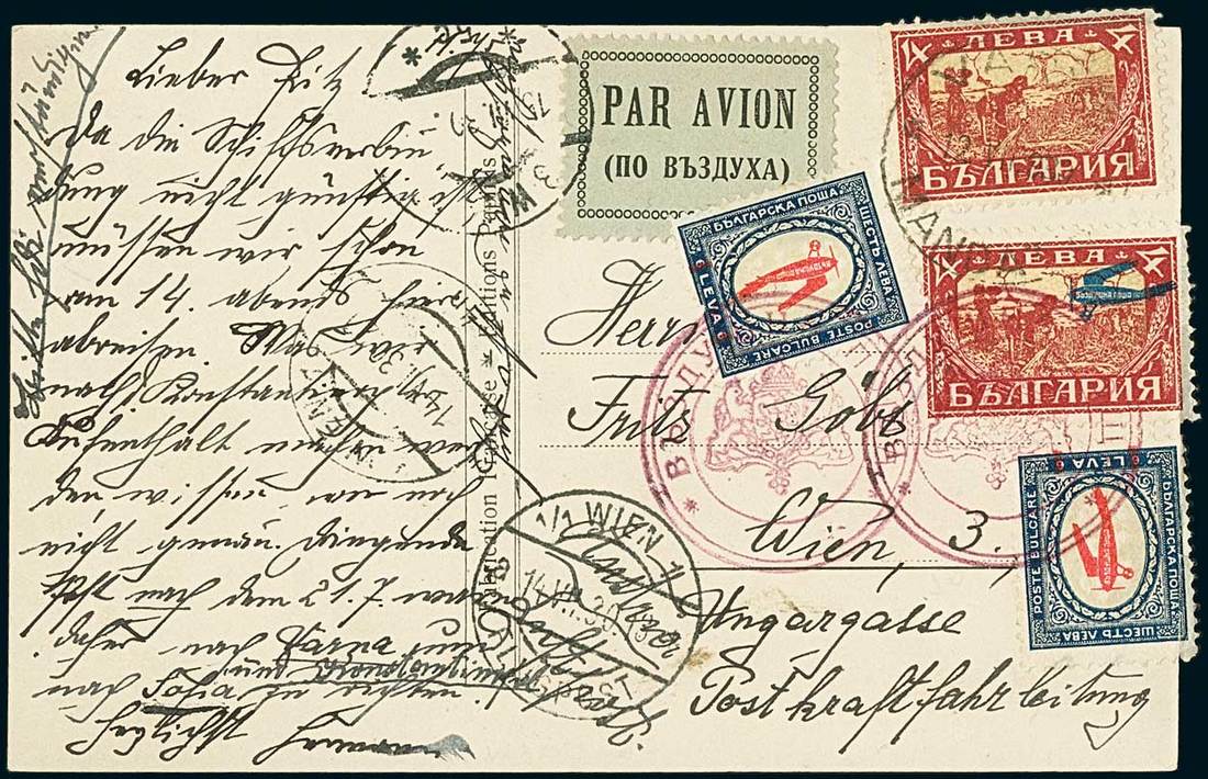 BulgariaAirmails1930, June 12. Postcard from Varna to Vienna, bearing 1925 4l. tied by c.d.s. on dispatch and 1927 airmail overprinted 1l. on 6l. (2) and 4l., tied by the airmail cachet of 1926 in purple, with "1926" year erased, and bilingual "Par Avion" blue label alongside. Exceedingly few items are recorded with the 1926 cachet being altered (it seems that the postal authorities were not convinced by the re-usage); the airmail label was sufficient to denote the transport. Cert. Hitzler. Mi.191, 206, 208. Photo