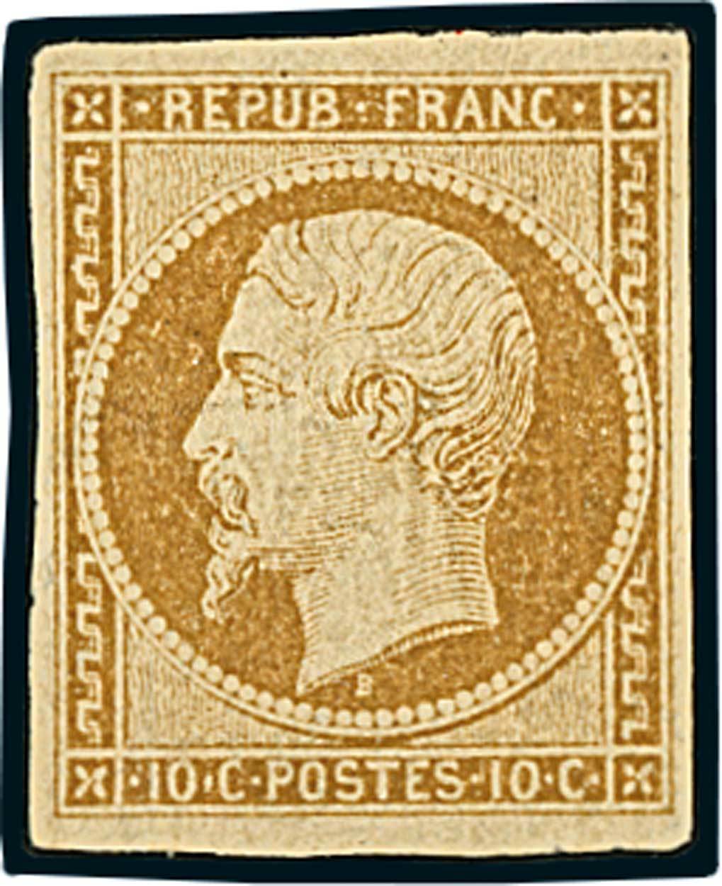 France1852, 10c. bistre-yellow, a mint example with original gum, graced by very good margins varying from wide to huge, as well as by its rich colour. Tiny tear in left-hand margin, two minute thin spots where the gum is missing and two vertical gum creases, all being slight imperfections which are not mentioned in the certificate which states this example to be superb. Of attractive appearance, a most desirable and highly difficult stamp in mint condition, which is rarely offered on the market. Cert. Roumet, signed Calves. Maury 9; € 48,500. Photo