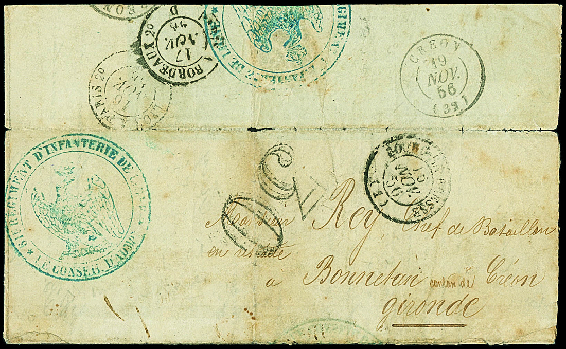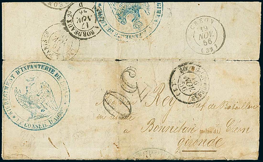 France30 October 1856. Entire letter from Crimea sent to the Commander of a retreating battalion in Bonnetan (France), rated with "30" décimes marking, with two strikes, on front and reverse, of "67e Régiment d'Infanterie de Ligne/Le Conseil d'Admon" circular cachet in blue. Various French transits on both sides. Manuscript signed notation with signature inside stating that the addressee had died in a hospital in Constantinople as a result of a shot in the skull. Some imperfections, not detracting from this very scarce usage from Crimea with cachet of a military unit. Photo