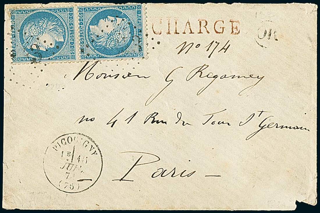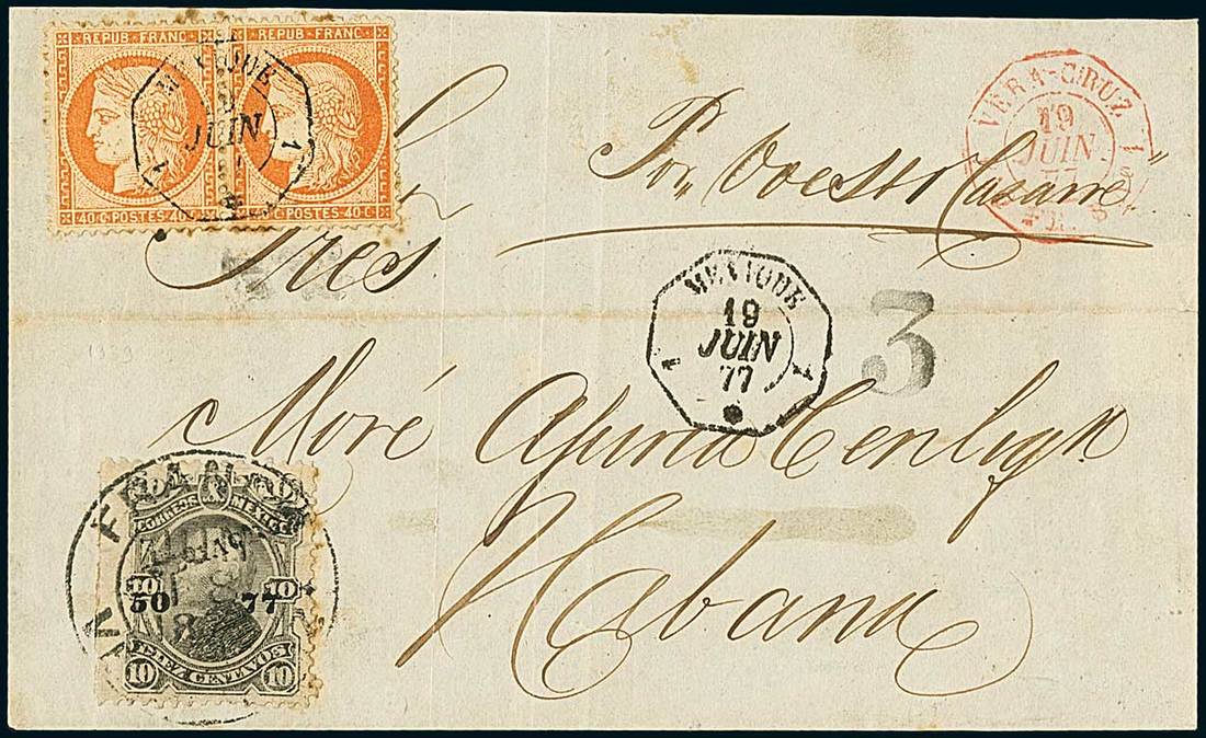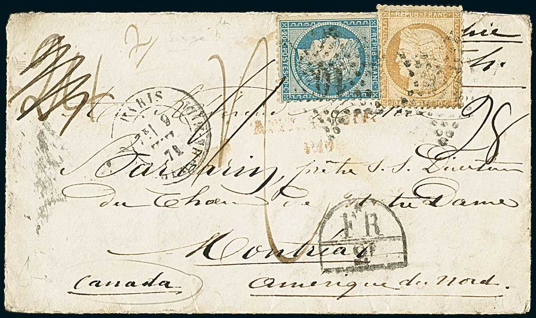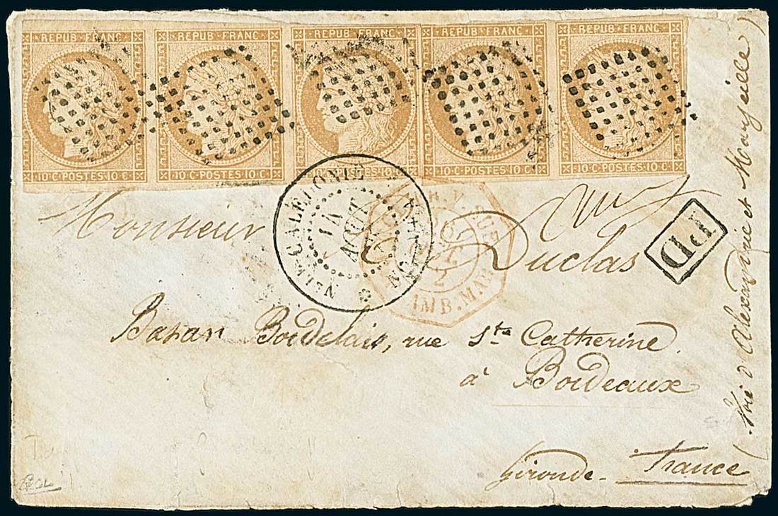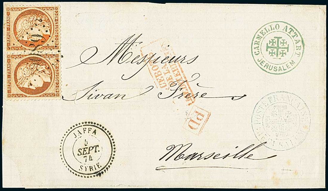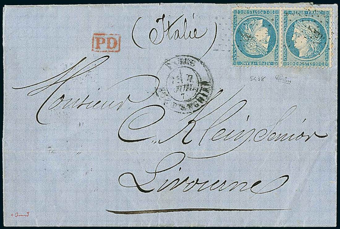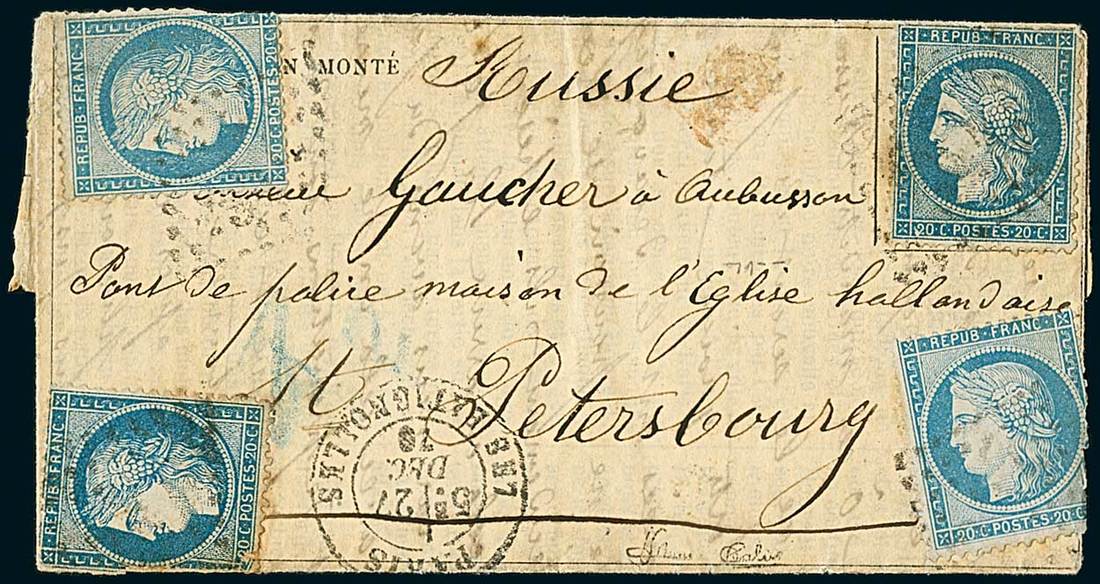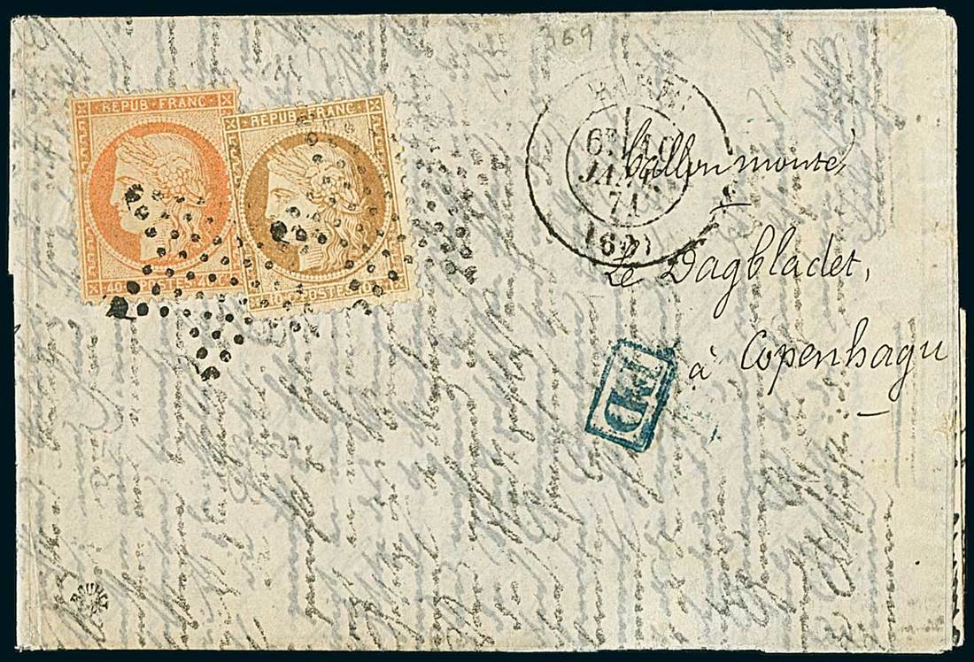 France1870, The Usages of the "Siège" Type Issues. The "Utilisation des Timbres au Type Siège" comprehensive collection making up an awarded postal-history exhibit comprising 128 pages, mounted with detailed descriptions and presented with discernment according to the following chapters: I. The Siege of Paris and its postal consequences: local mail during the Siege, ballon montées including scarce destinations, rare censored mail, P.O.W. mail, the "Commune" with detained mail and external correspondence. II. Usages after the War: including better cancellations, underfranked mail, telegram, exceptional frankings, varieties, 10c. bisects, printed matter rates, 20c. tête-bêches, insured mail featuring high frankings, acknowledgement of receipt forms, postal fraud accompanied by legal-process document issued by the post, postal relationships with occupied territories, external mail sent to the Colonies, French P.O.'s abroad and other foreign territories (including two combination frankings, rare exotic destinations, one cover sent through the Consul in Panama addressed to a navy sailor stationed in the South Pacific, etc.) III. French P.O.'s abroad: a quite comprehensive section including infrequent territories and various mixed frankings with local issues. IV. Maritime mail: including the Mediterranean with one item bearing strip of four containing one tête-bêche; the Atlantic featuring mixed frankings with Venezuela (very rare), Mexico and Argentina. V. Usages in the Colonies: comprising Guadeloupe, Martinique, Guiana, Reunion, India, Polynesia, Cochinchina, New Caledonia, St. Pierre et Miquelon, and Senegal. A magnificent opportunity to obtain an advanced collection dedicated to a French significant and popular issue, formed after years of search and research. Photo