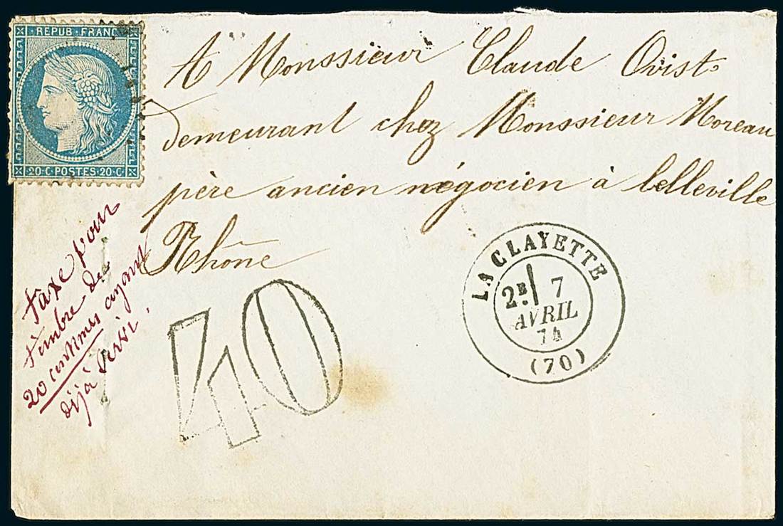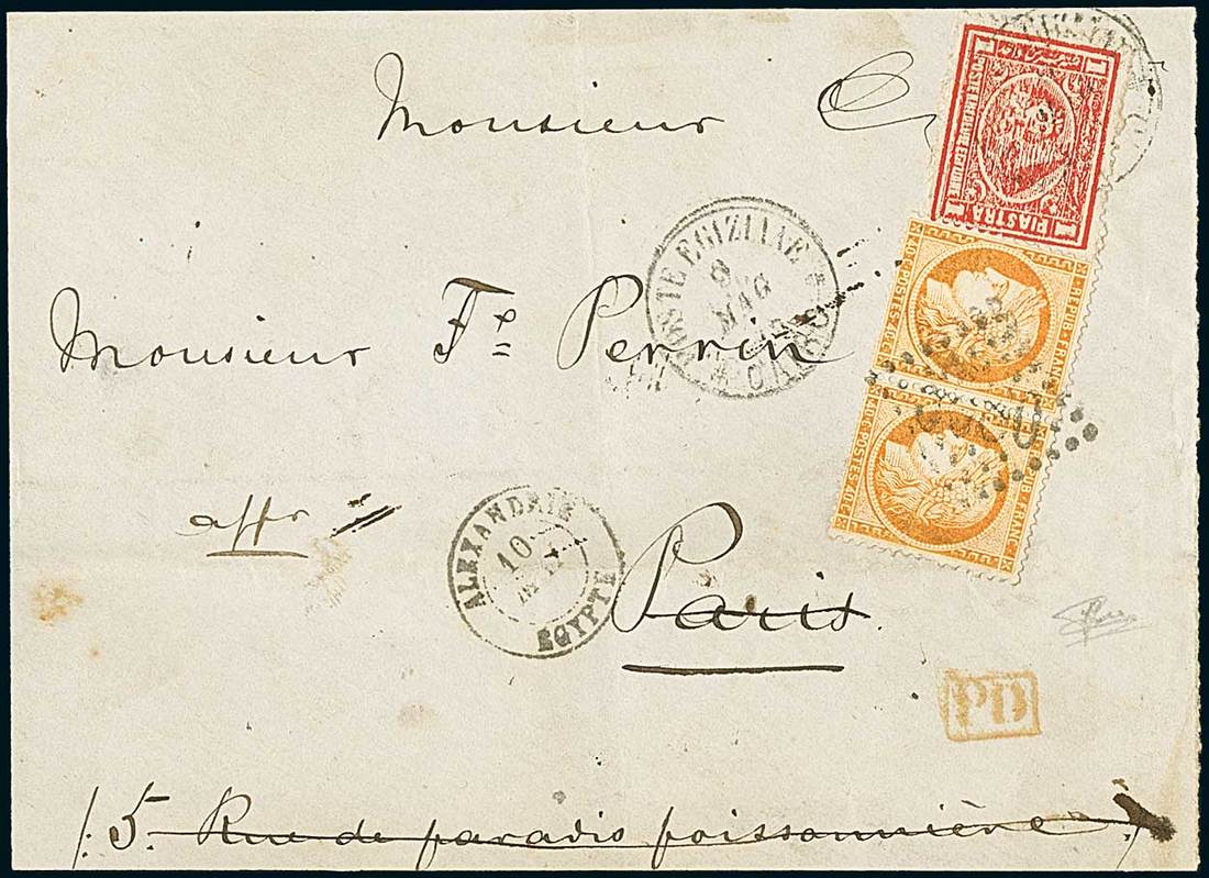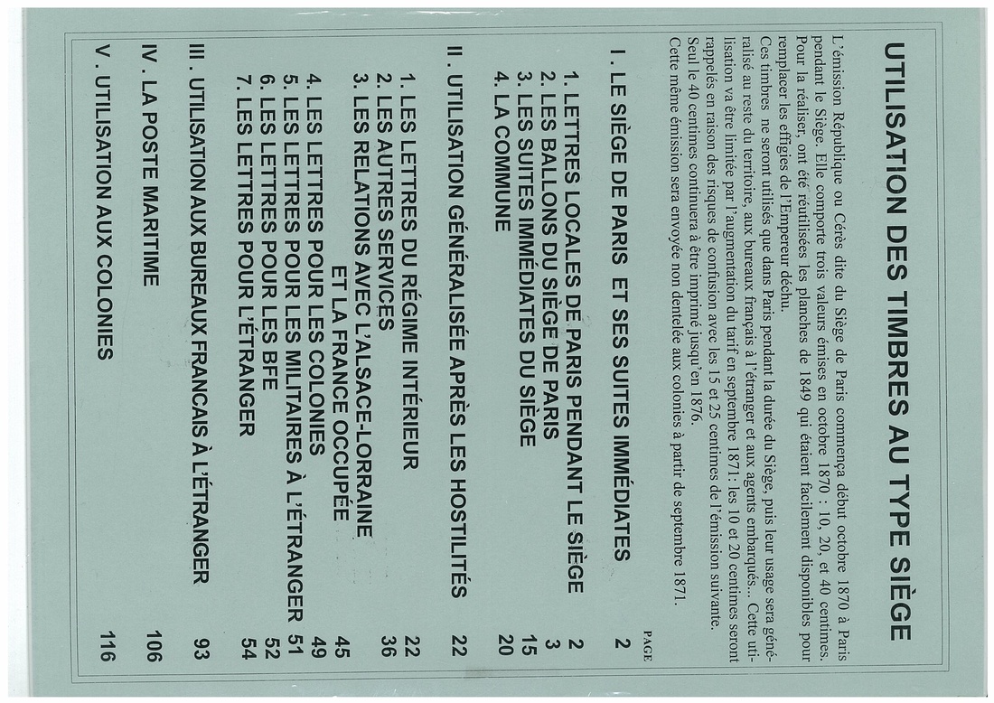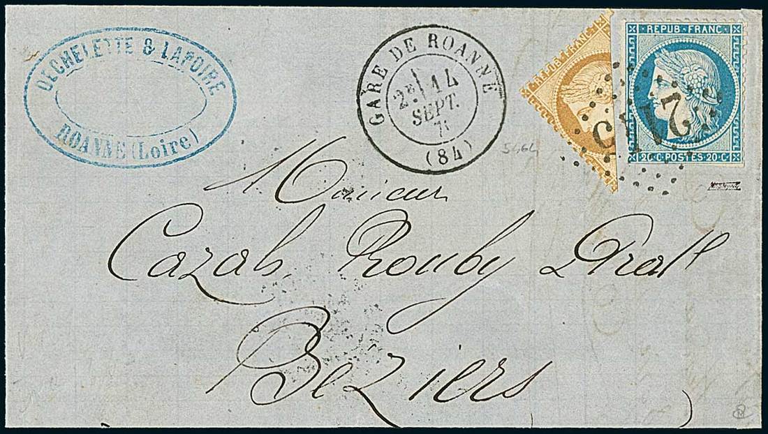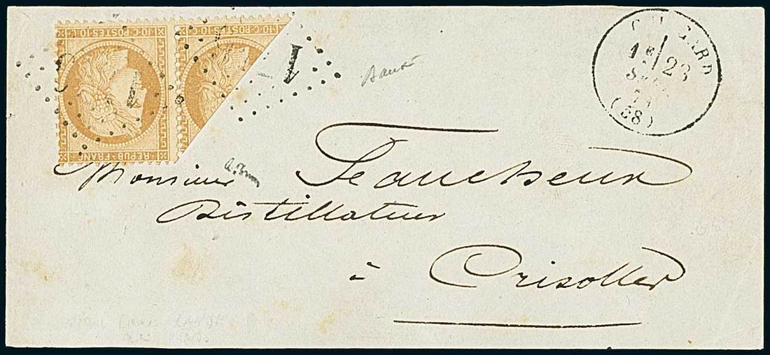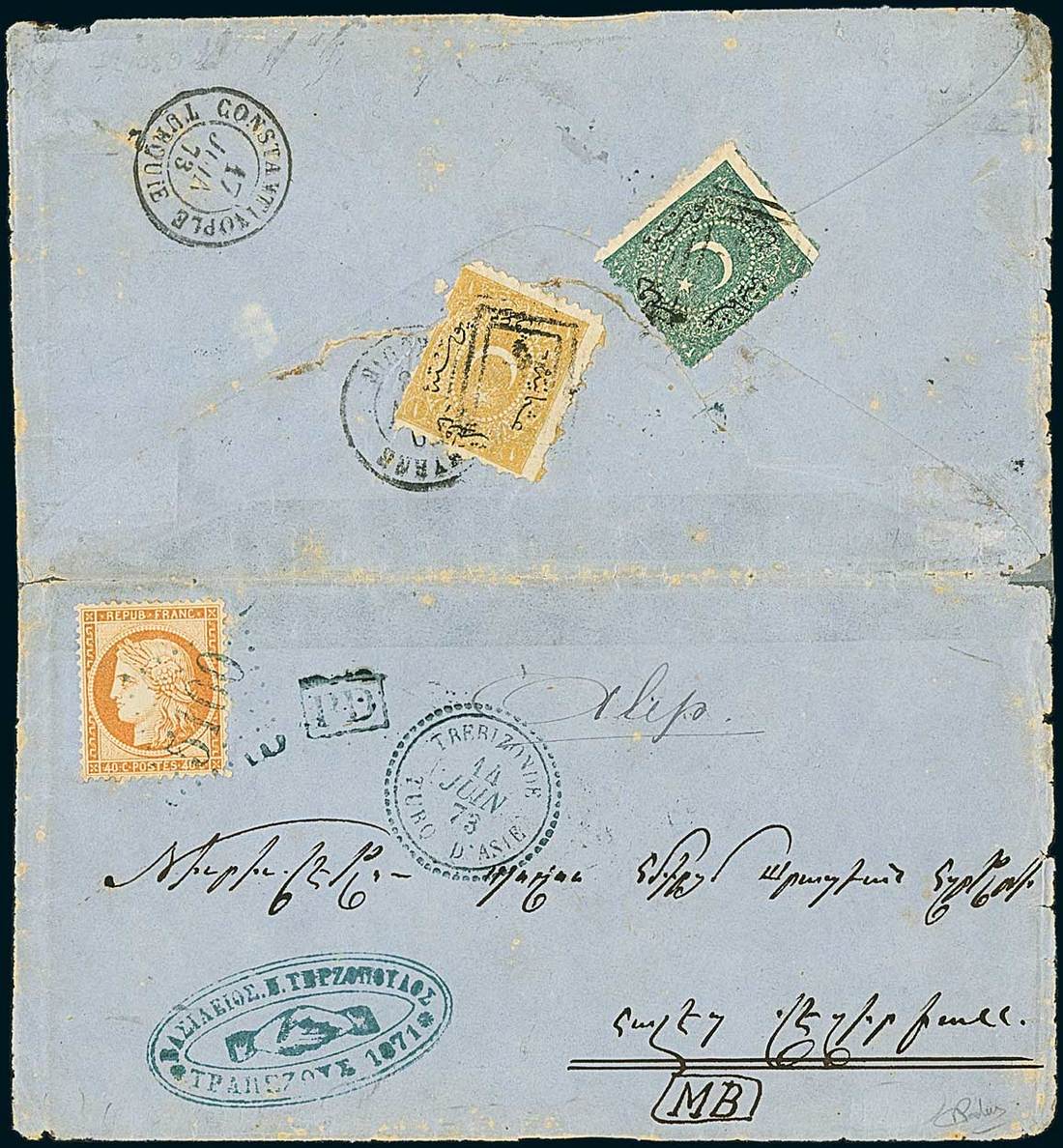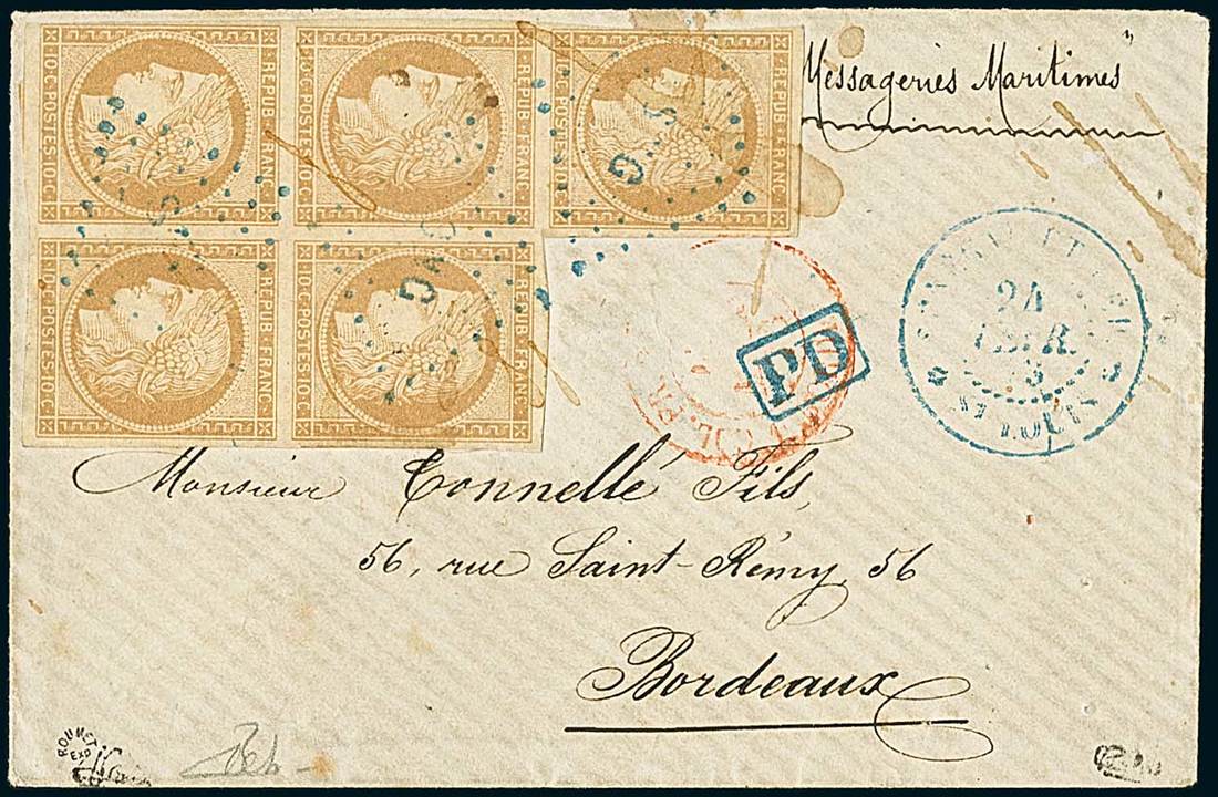France1870, The Usages of the "Siège" Type Issues. The "Utilisation des Timbres au Type Siège" comprehensive collection making up an awarded postal-history exhibit comprising 128 pages, mounted with detailed descriptions and presented with discernment according to the following chapters: I. The Siege of Paris and its postal consequences: local mail during the Siege, ballon montées including scarce destinations, rare censored mail, P.O.W. mail, the "Commune" with detained mail and external correspondence. II. Usages after the War: including better cancellations, underfranked mail, telegram, exceptional frankings, varieties, 10c. bisects, printed matter rates, 20c. tête-bêches, insured mail featuring high frankings, acknowledgement of receipt forms, postal fraud accompanied by legal-process document issued by the post, postal relationships with occupied territories, external mail sent to the Colonies, French P.O.'s abroad and other foreign territories (including two combination frankings, rare exotic destinations, one cover sent through the Consul in Panama addressed to a navy sailor stationed in the South Pacific, etc.) III. French P.O.'s abroad: a quite comprehensive section including infrequent territories and various mixed frankings with local issues. IV. Maritime mail: including the Mediterranean with one item bearing strip of four containing one tête-bêche; the Atlantic featuring mixed frankings with Venezuela (very rare), Mexico and Argentina. V. Usages in the Colonies: comprising Guadeloupe, Martinique, Guiana, Reunion, India, Polynesia, Cochinchina, New Caledonia, St. Pierre et Miquelon, and Senegal. A magnificent opportunity to obtain an advanced collection dedicated to a French significant and popular issue, formed after years of search and research. Photo