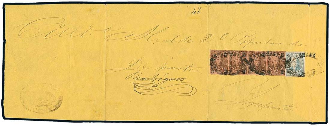 Mexico1868, Queretaro, "12-68". 100c. brown on brown perf., thin figures, pair and two singles, and 25c. blue on pink, thick figures, used on large judicial wrapper front to Irapuato, tied by Salamanca double-oval postmark (Schatzkès fig. 1331). A very rare and probably unique franking. Cert. Jaretzky. Follansbee quotes each 100c. value at $ 600. Scott 57, 61. Photo