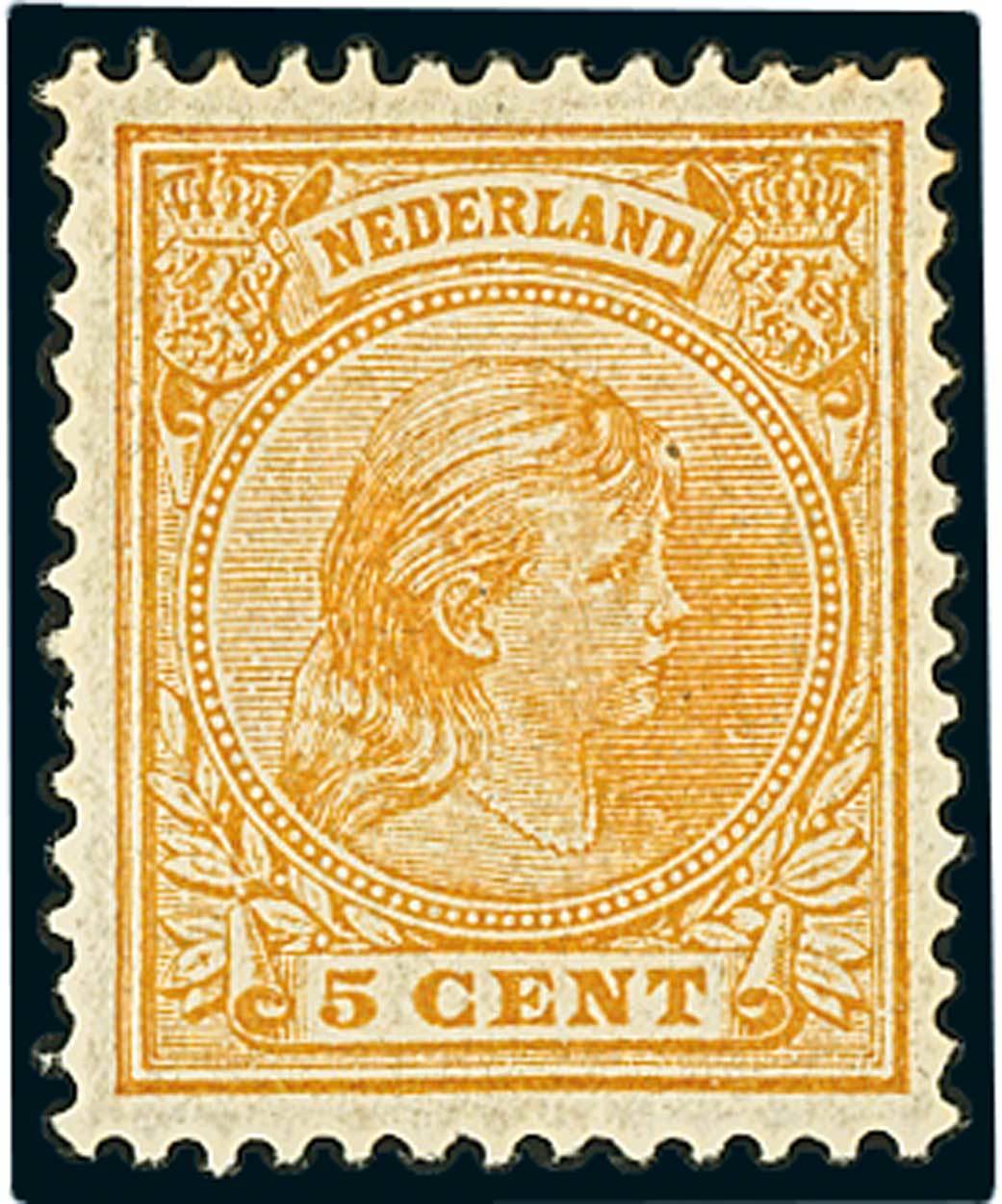 Netherlands1891, 5c. orange, plate proof in the colour of the 3c. denomination, very well centred with original gum. Small and faint thin spot, of no importance for this proof, as usually encountered with nearly all, of the only 14 examples known, having imperfections. Very desirable. Cert. Muis. NVPH 38v; € 5,000. Photo